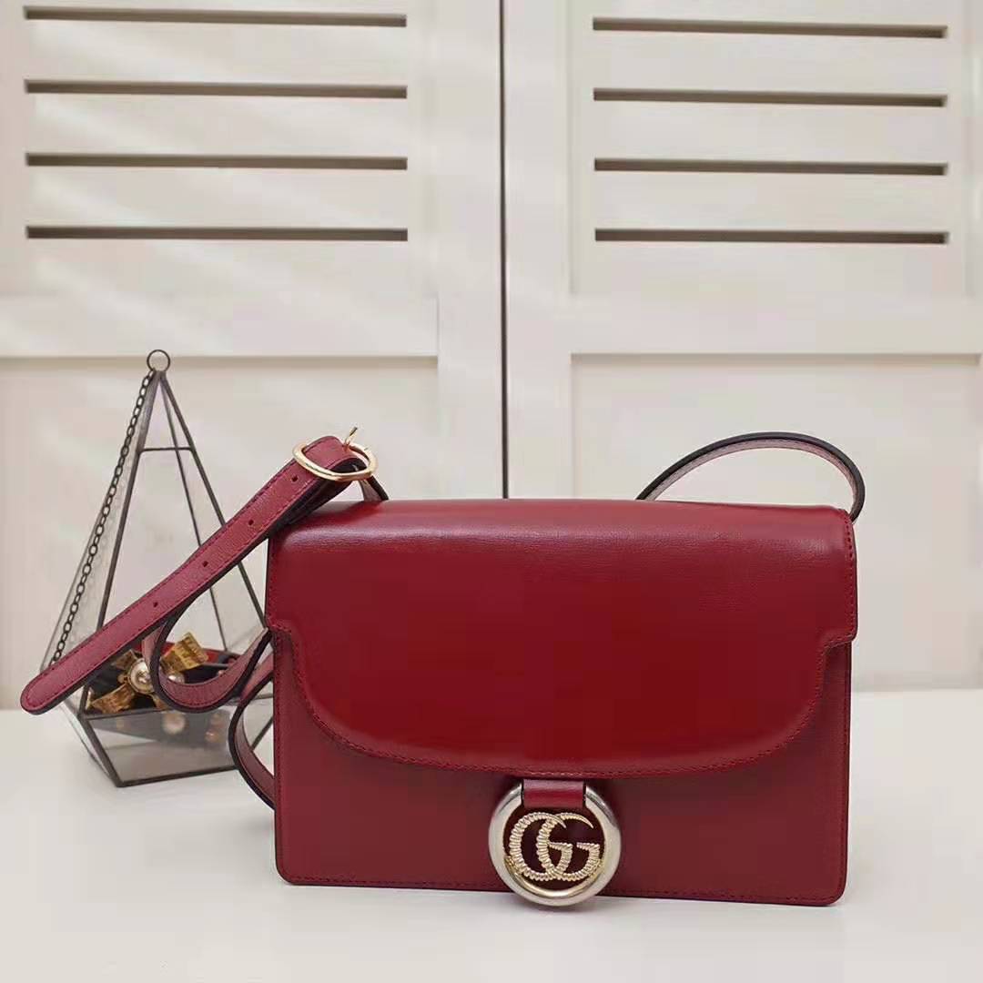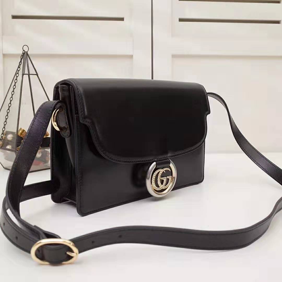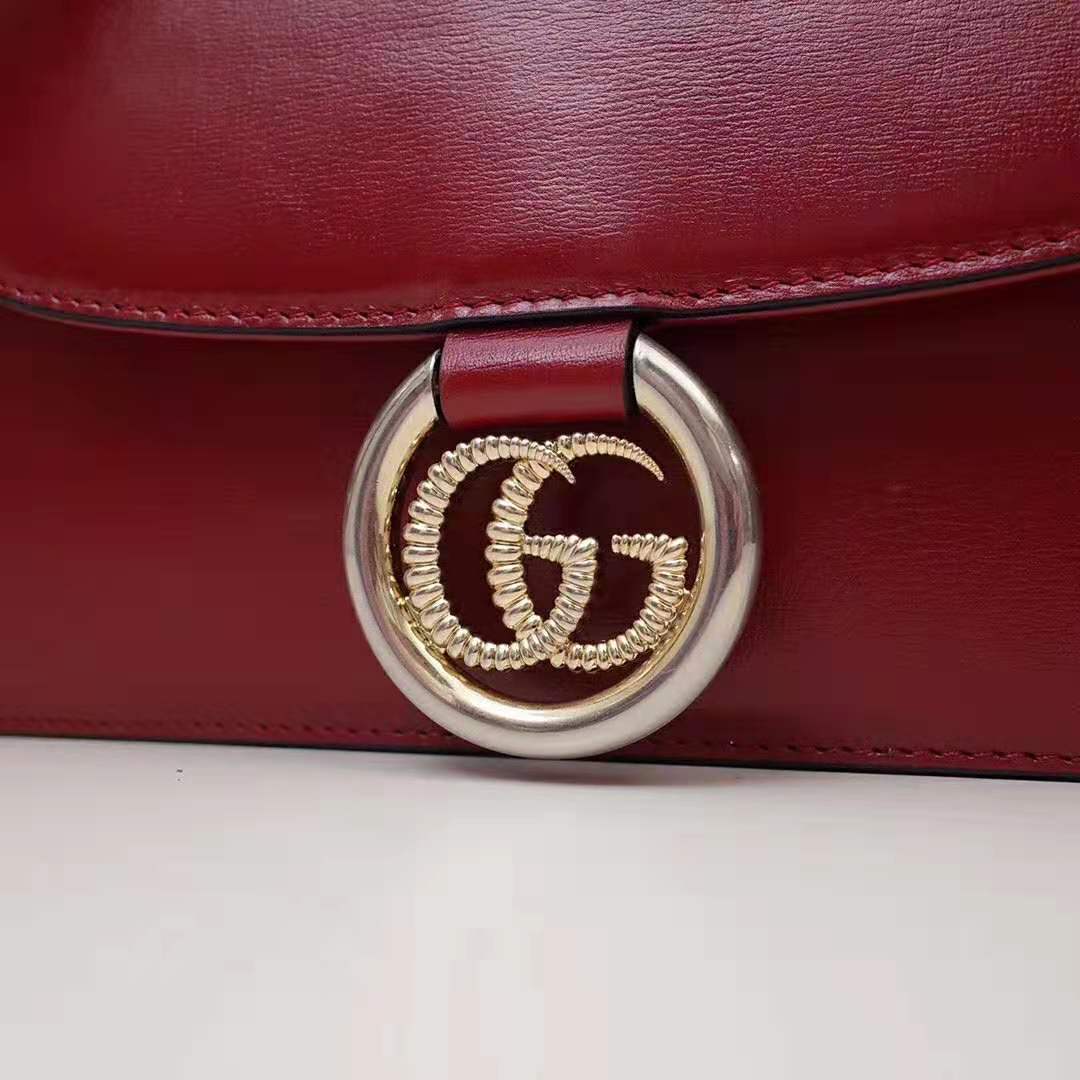 Presented in textured dusty grey leather, this small structured shoulder bag introduced for Fall Winter 2019 reintroduces the Double G with a twisted torchon finish surrounded by a ring.