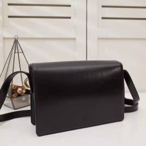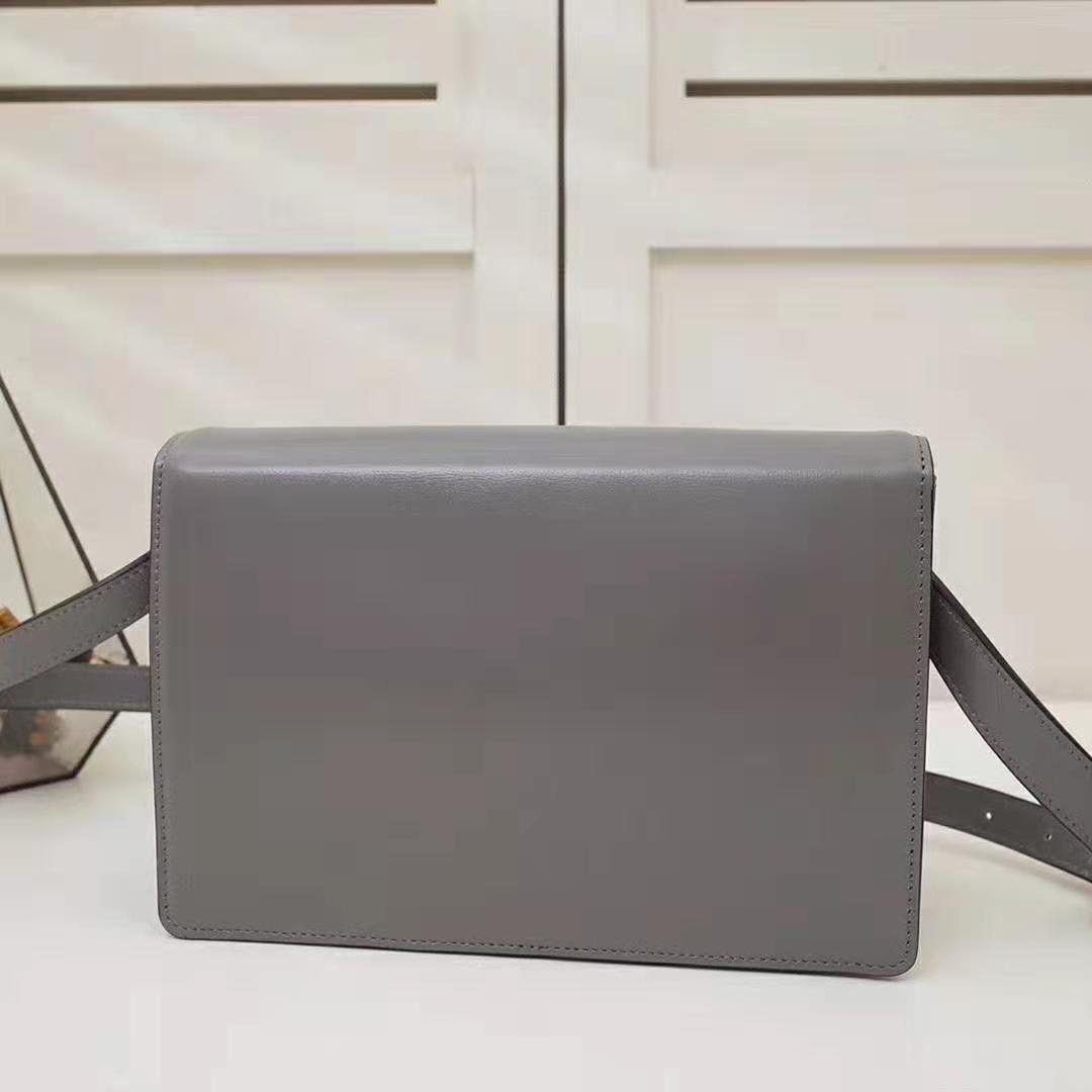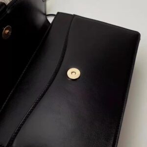 The silhouette is completed with an adjustable leather shoulder strap and a flap closure with a hidden pocket detail.