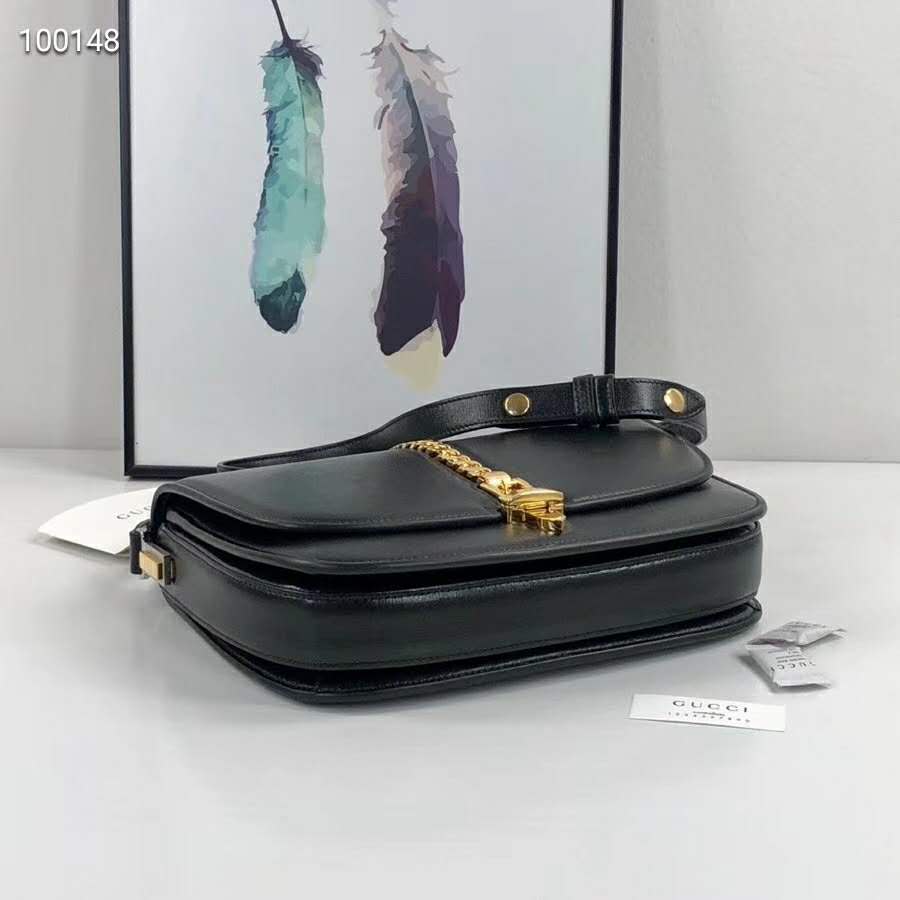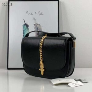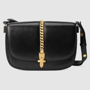 The small shoulder bag in textured black leather is defined by a narrow gold-toned metal chain fitted to the flap—a modern interpretation of the distinctive hardware.
