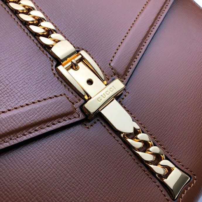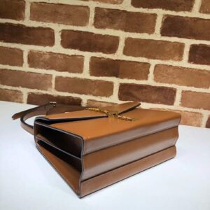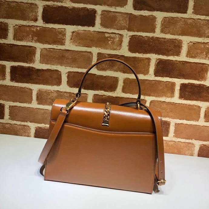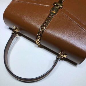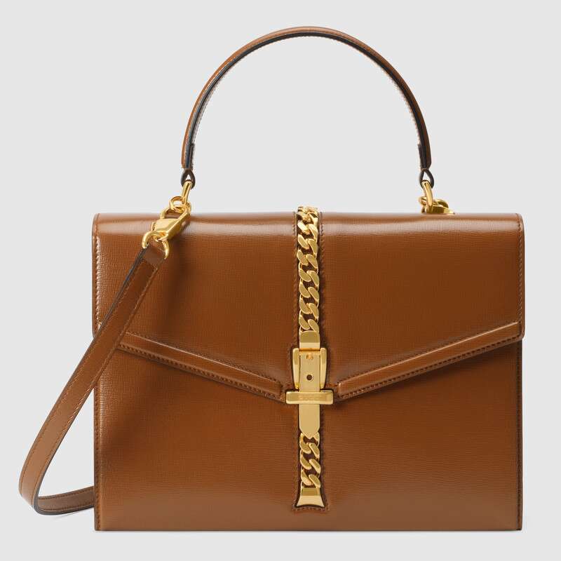The structured top handle in textured brown leather is defined by a narrow gold-toned metal chain fitted to the flap and body of the bag—a modern interpretation of the distinctive hardware. The silhouette is completed with a detachable and adjustable shoulder strap.
