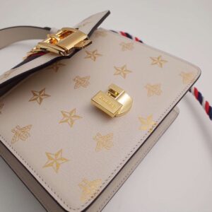 Made in bees and stars printed leather, the structured silhouette is designed with a fixed leather top handle.