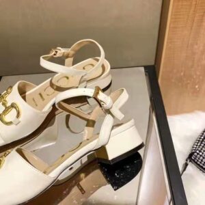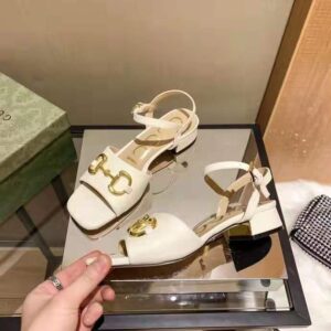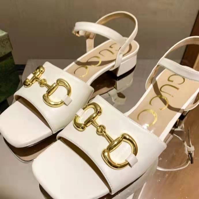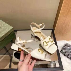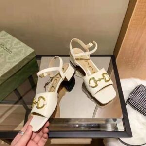 An open-toed sandal in white leather defined by the House’s emblematic Horsebit hardware.