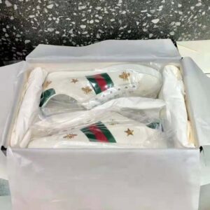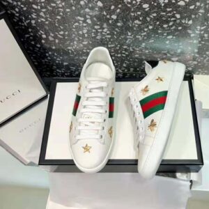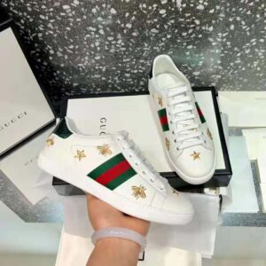Our classic low-top sneaker with gold thread-embroidered bees and stars, two of Alessandro Michele’s signature details.