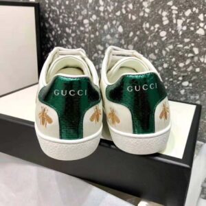 White leather with gold thread-embroidered bees and stars and green ayers snake detail at the heel