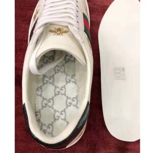 White leather with gold thread-embroidered bees and stars and green ayers snake detail at the heel