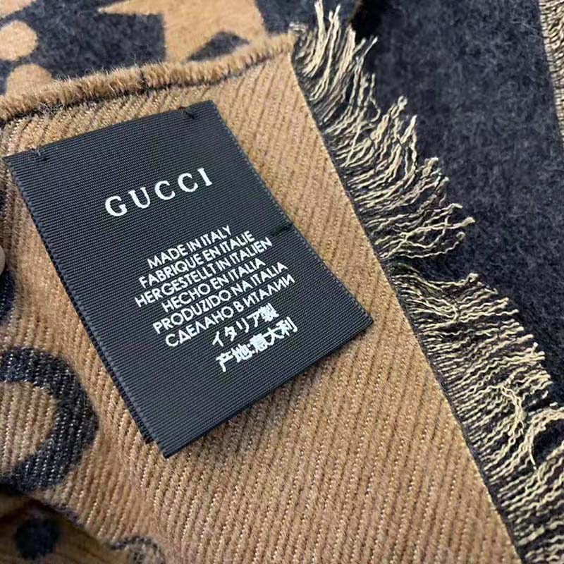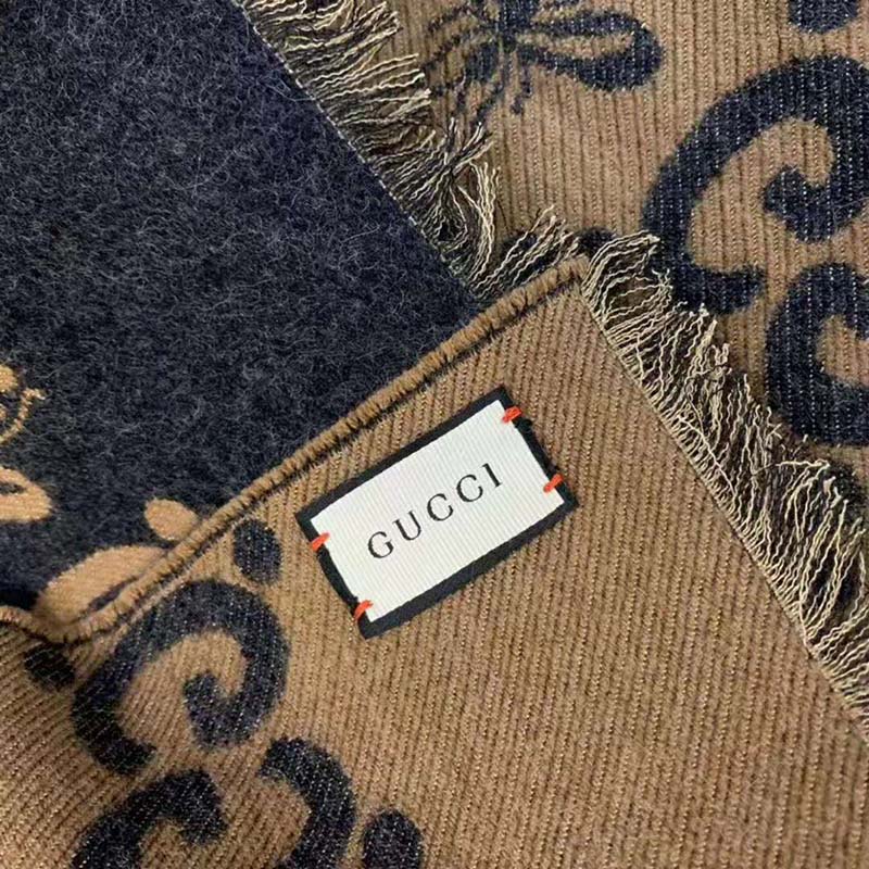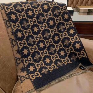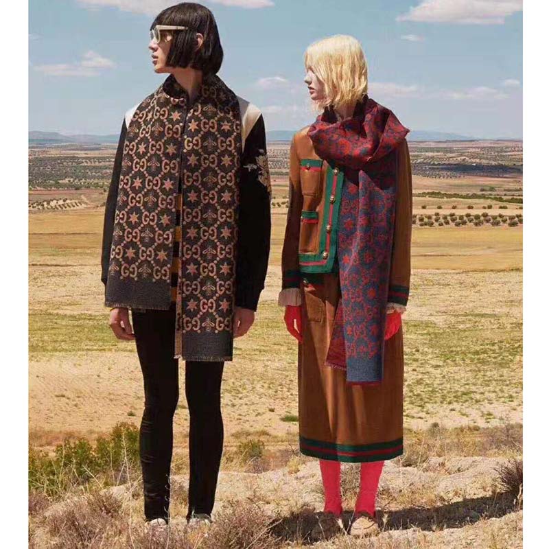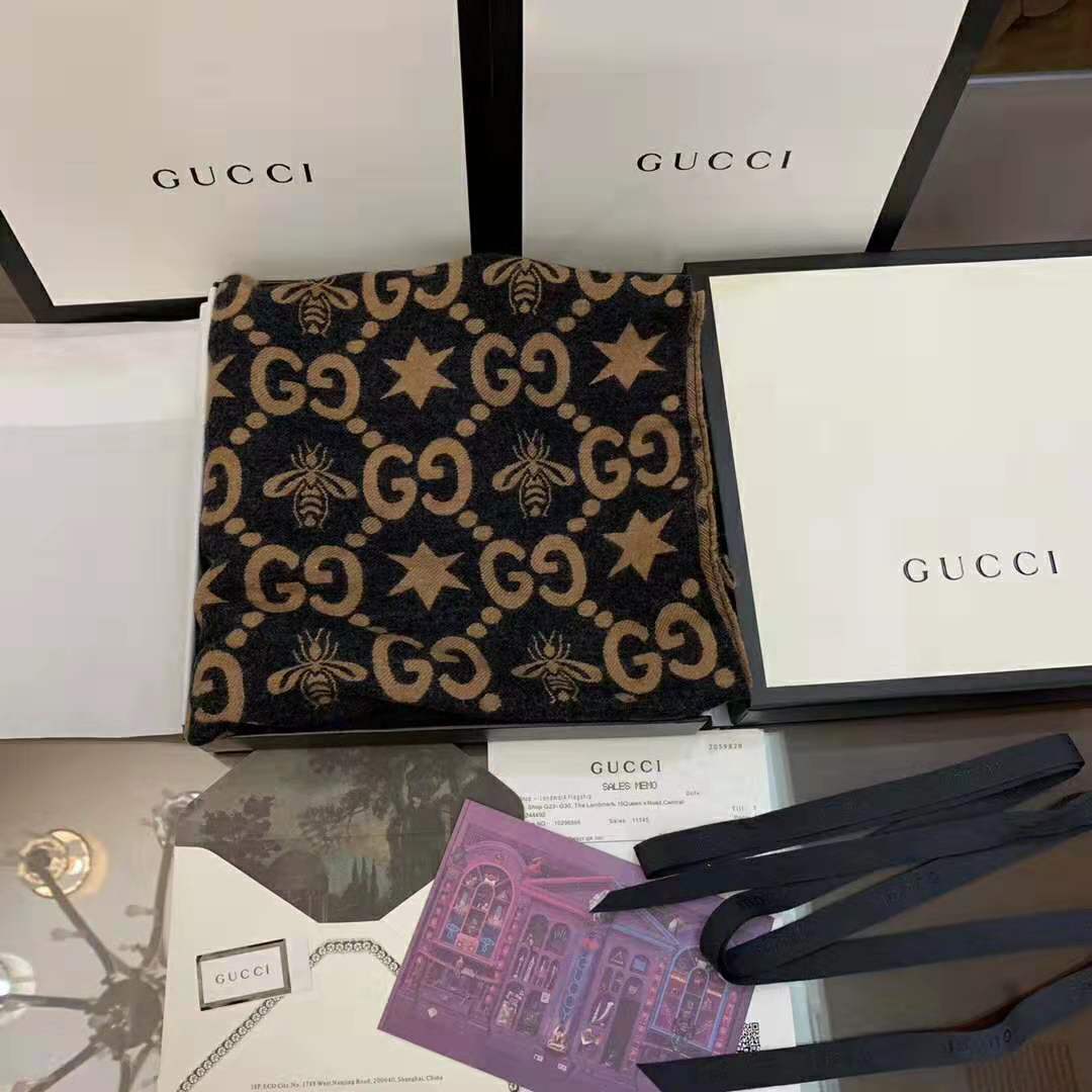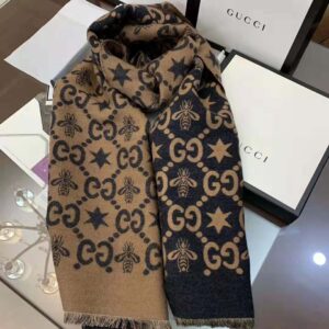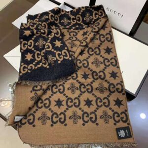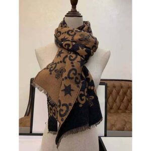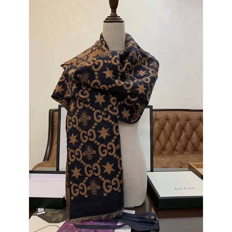 Gucci Unisex Bees And Stars GG Jacquard Scarf in Wool and Silk Brown