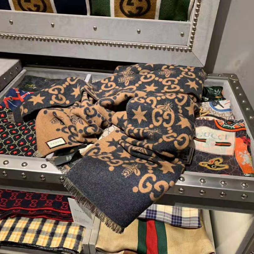 The GG pattern on this wool-silk scarf is reimagined in a contemporary way, intermingled with stars and the Gucci bee.