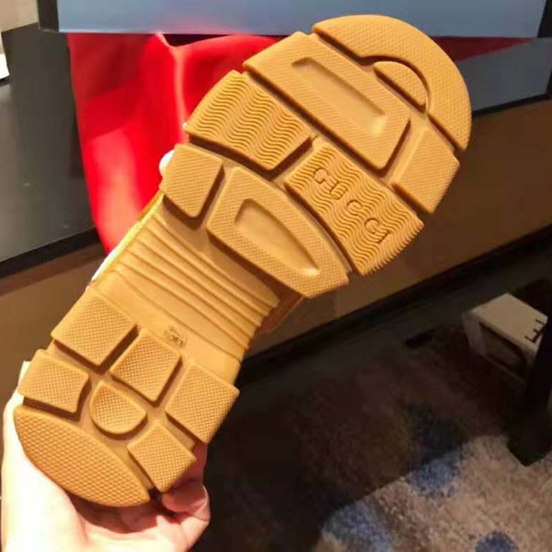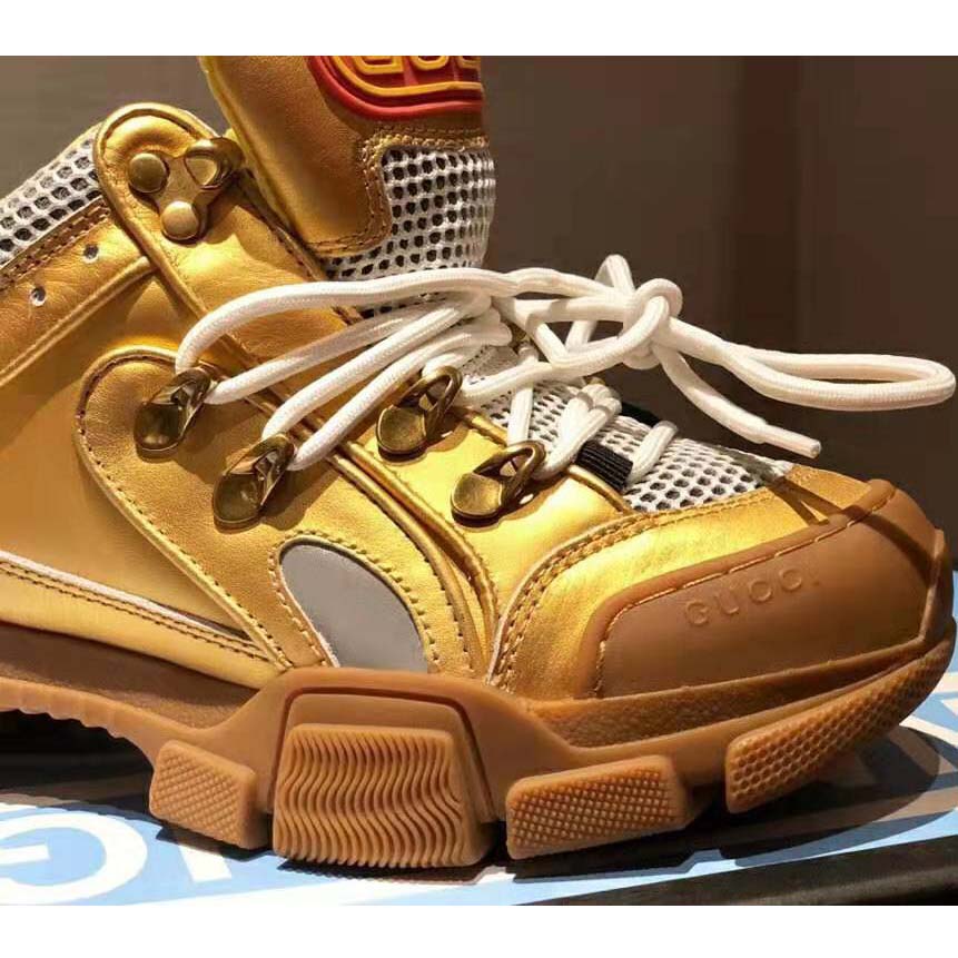 Gold metallic leather, white mesh, grey reflective fabric