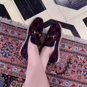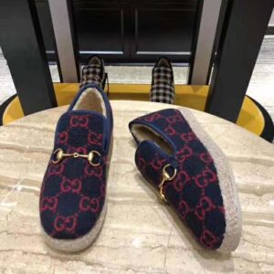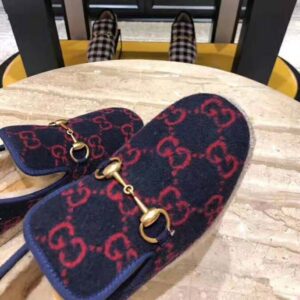 Presented in a blue and red GG wool fabric—a contemporary interpretation of the original 1930s design—the shoe is topped with one of Gucci’s iconic design details, defining the line: the Horsebit.