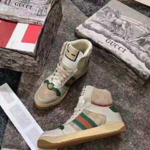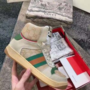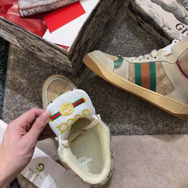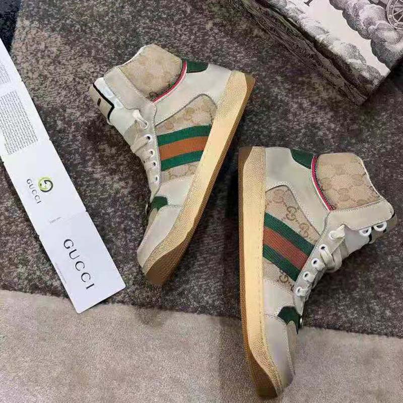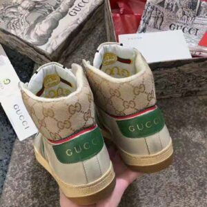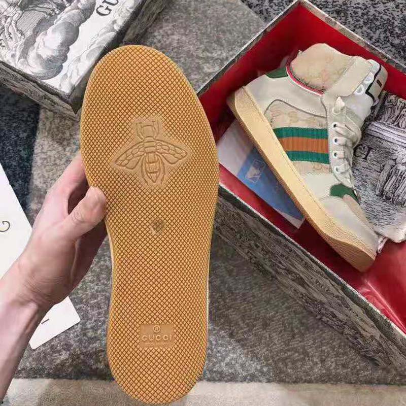 Influenced by classic trainers from the ’70s, and named for the defensive sports move, these high-top sneakers in GG canvas feature the Web stripe on the side and vintage Gucci logo, treated for an allover distressed effect.