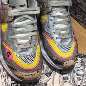 A new style introduced for Fall Winter 2019, this shoe blends a tejus printed leather with distressed suede, metallic leather, reflective fabric and mesh trims.