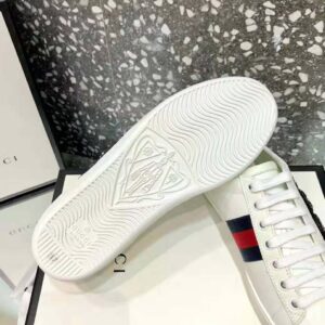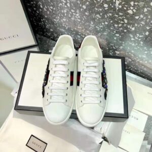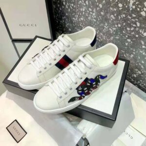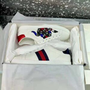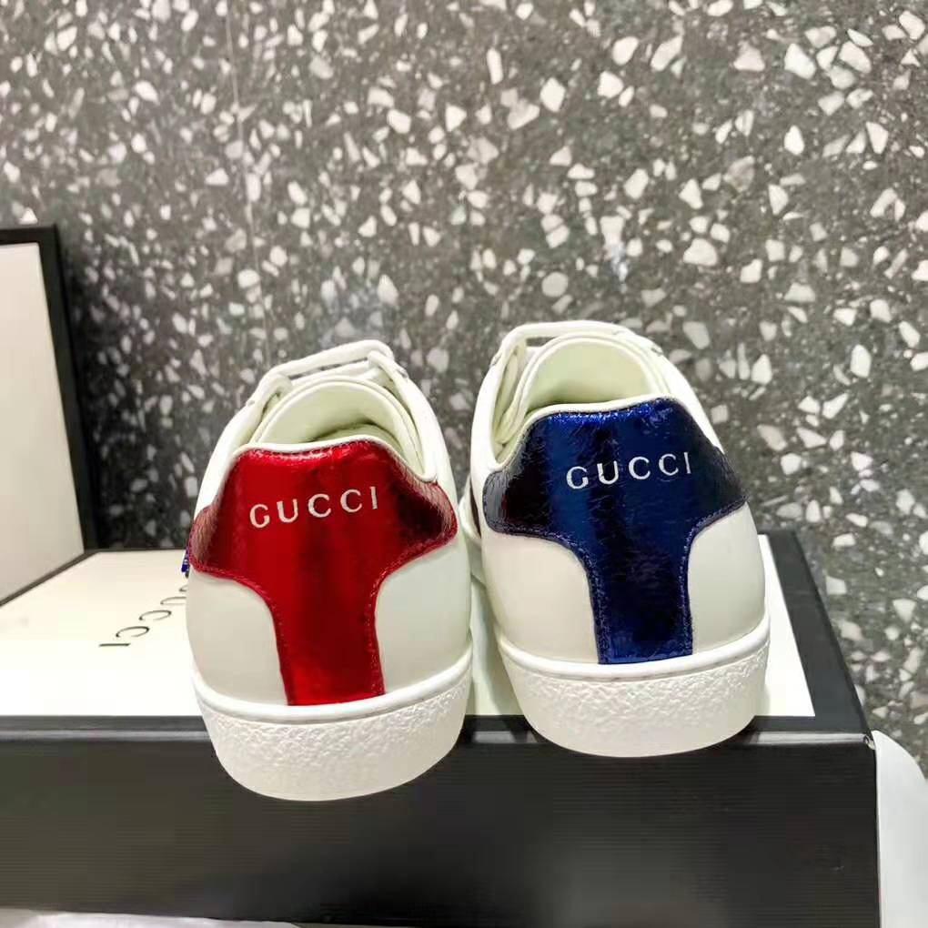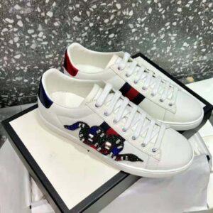 The now classic Ace low-top sneaker has a new intricately designed crystal embroidered Kingsnake appliqué against the blue and red Web.