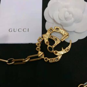 The Double G is studded with multicolored crystals that create a kaleidoscope effect, descending into a chain drop with a smaller version of the House emblem and drop pearl.