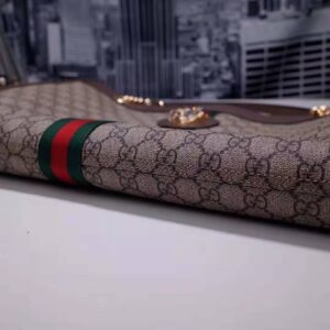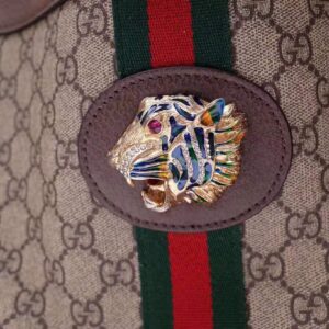 The bag combines the signature House monogram with the Web stripe in its classic green and red combination.