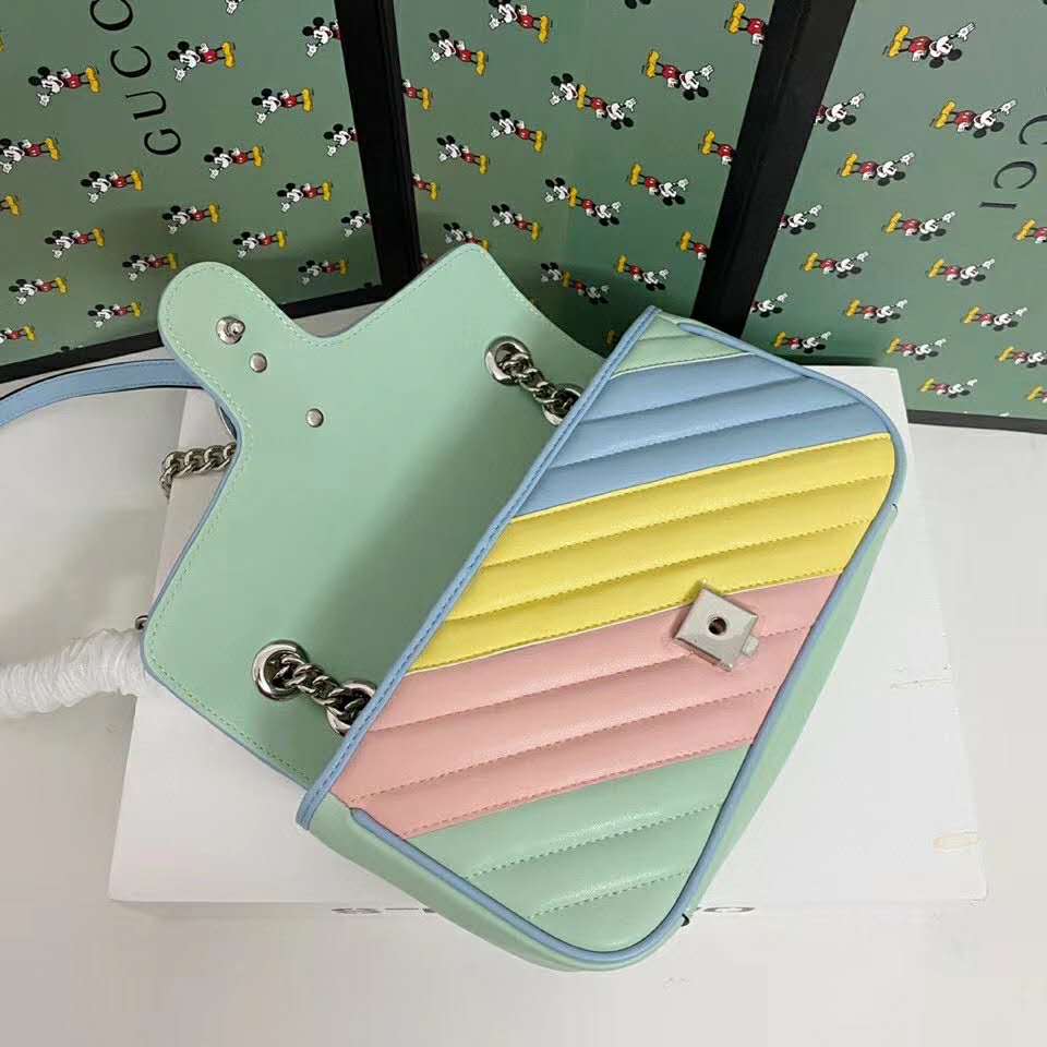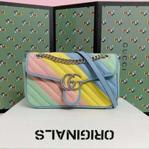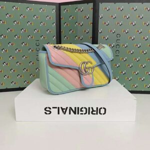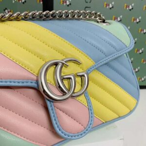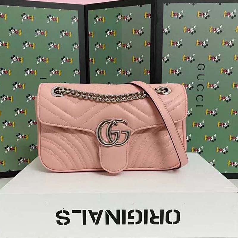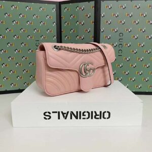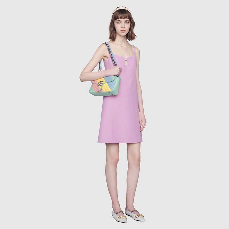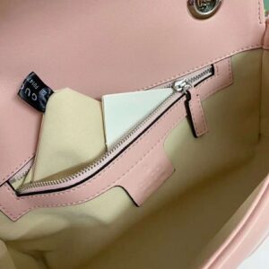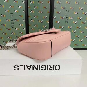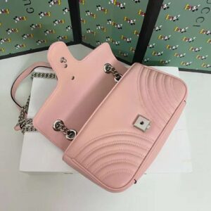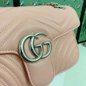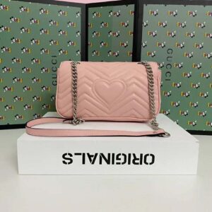 Made in matelassé chevron leather with a heart on the back in a light shade of pink, the now recognizable small GG Marmont chain shoulder bag has a softly structured shape and a flap closure with Double G hardware.