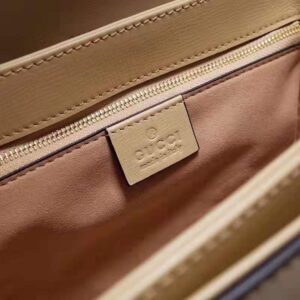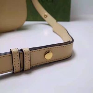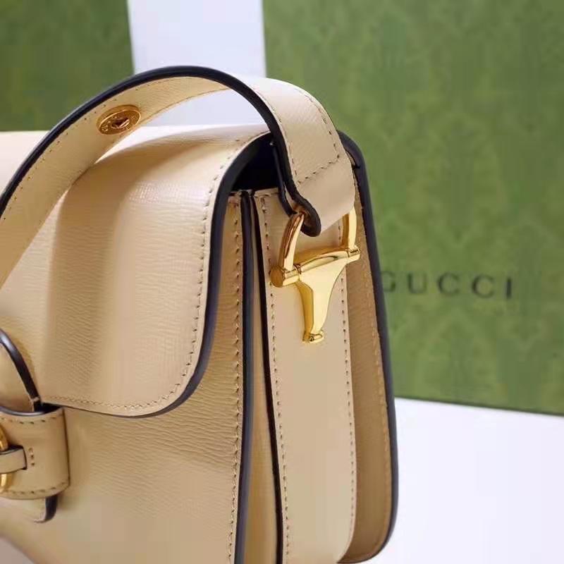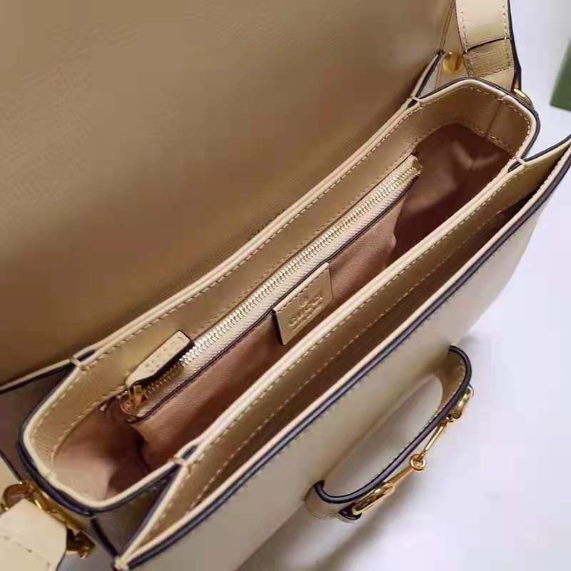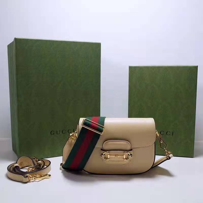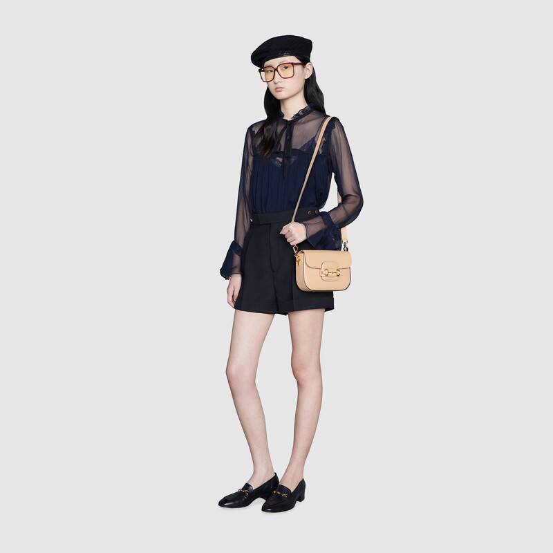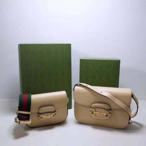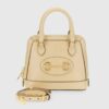 Petite versions of the Gucci Horsebit 1955 add a hybrid twist to the vintage inspired line. Enriched with two different shoulder straps, the white leather mini bag’s character transforms from understated elegance with a tonal leather strap to a strong logo feel thanks to a red and green Web option.