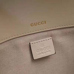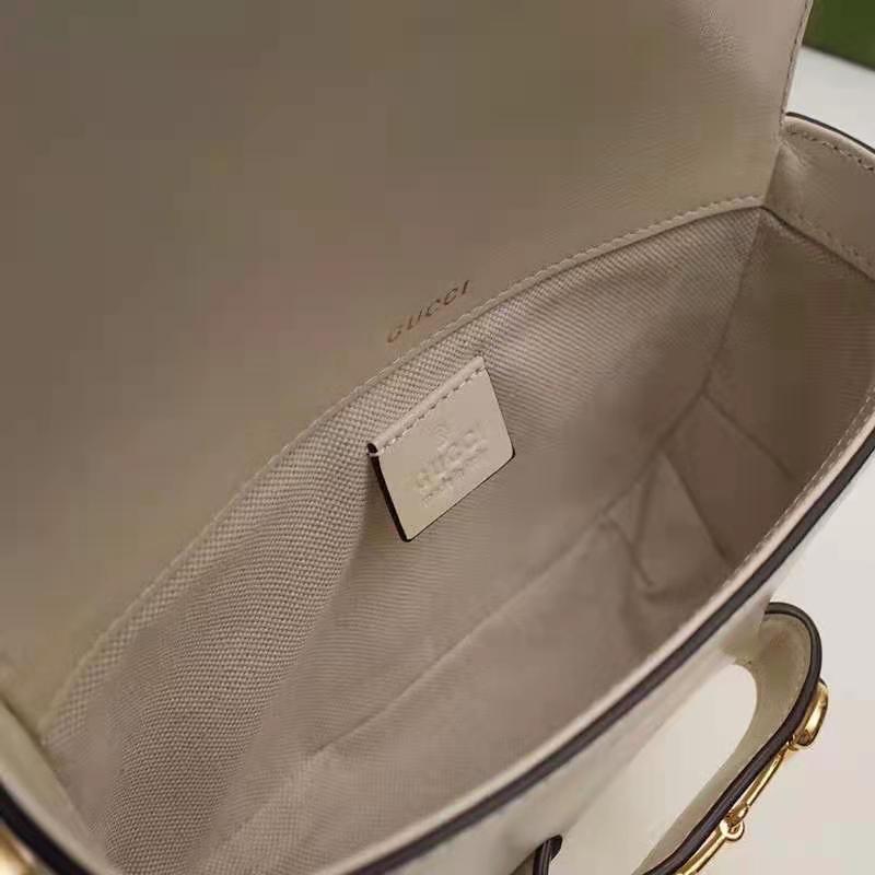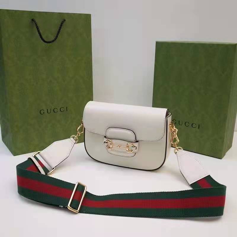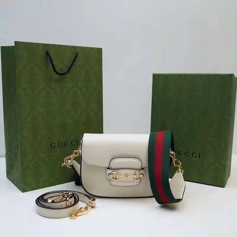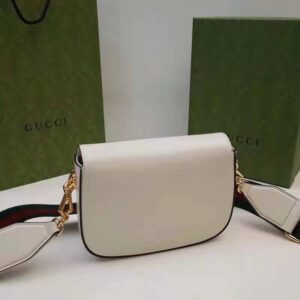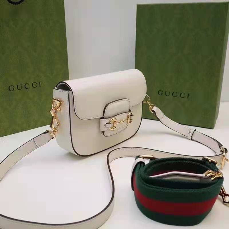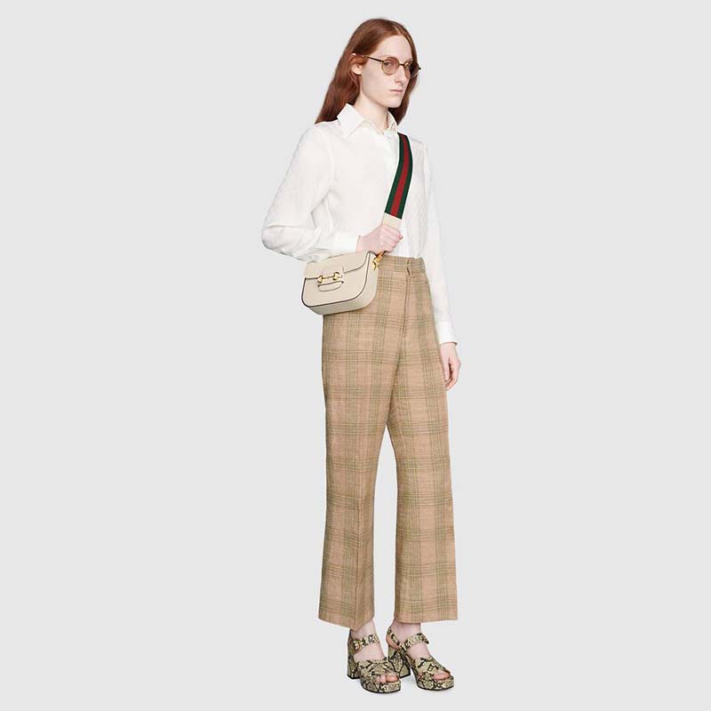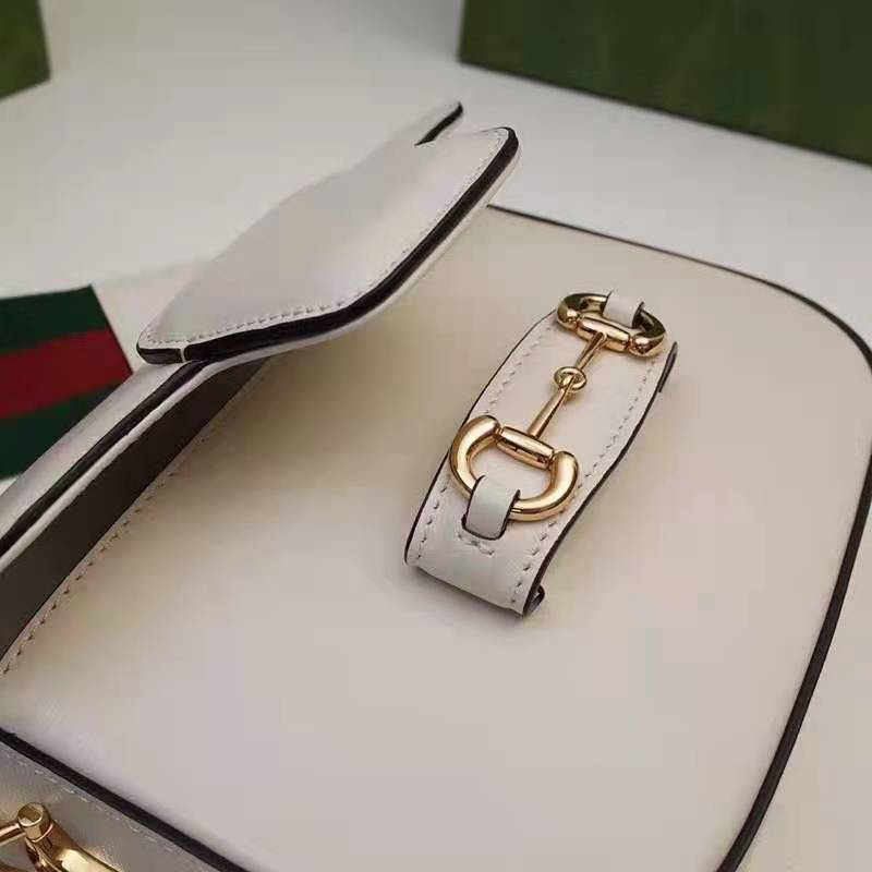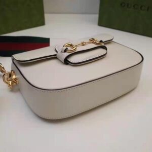 Petite versions of the Gucci Horsebit 1955 add a hybrid twist to the vintage inspired line. Enriched with two different shoulder straps, the white leather mini bag’s character transforms from understated elegance with a tonal leather strap to a strong logo feel thanks to a red and green Web option.