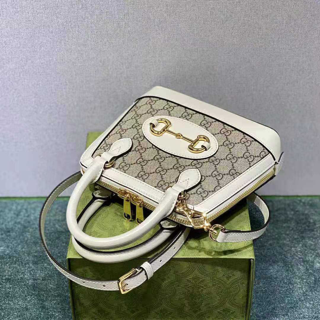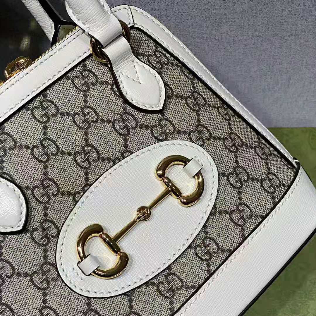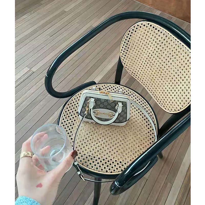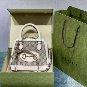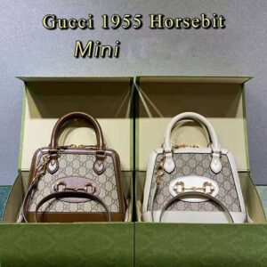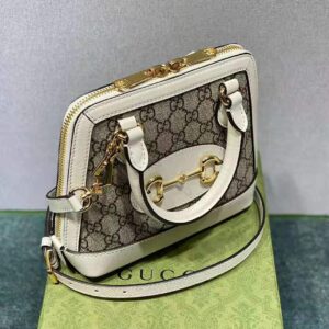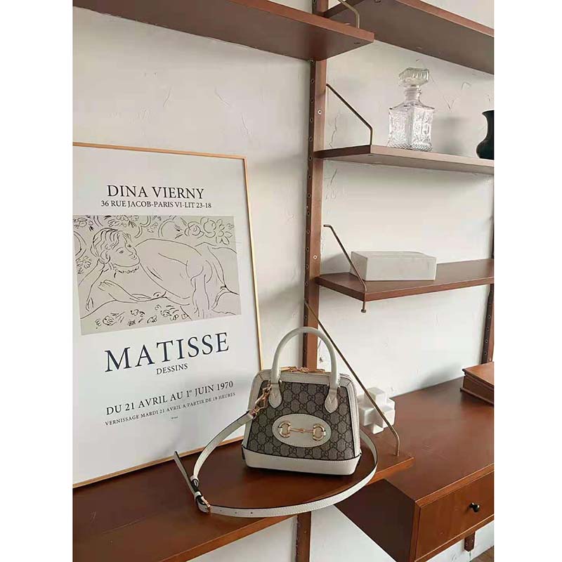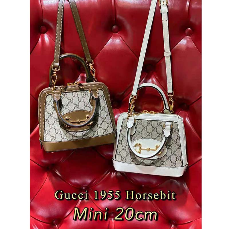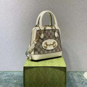A new introduction to the Gucci Horsebit 1955 line, the mini top handle is crafted from the House’s monogram canvas with contrasting white leather details.