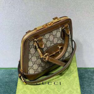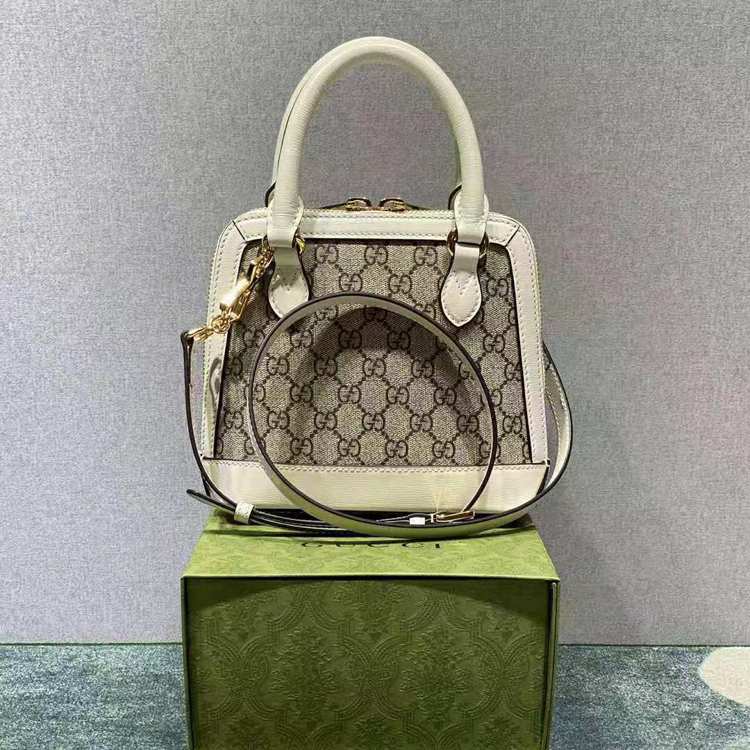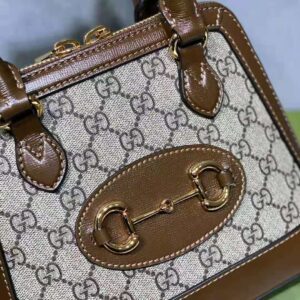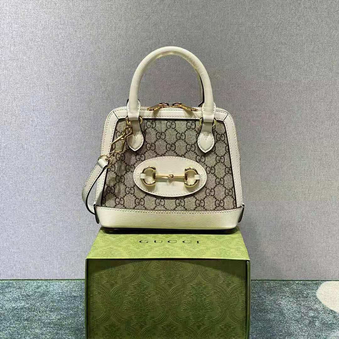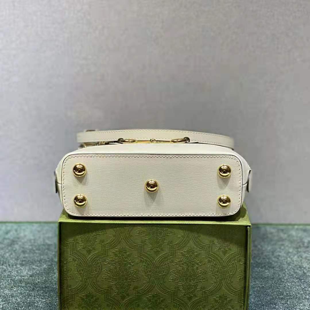 A new introduction to the Gucci Horsebit 1955 line, the mini top handle is crafted from the House’s monogram canvas with contrasting white leather details.