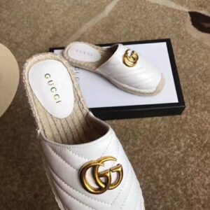 Finished with the emblematic Double G hardware the espadrille is updated in a slide silhouette, presented in soft matelassé leather with a chevron pattern.