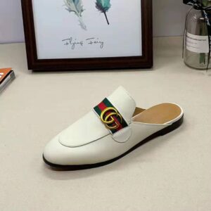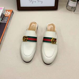 The Double G antique gold-toned hardware is set on a blue and red Web ribbon of these leather slippers.