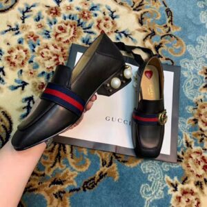 The stacked heel has a row of GG pearls and studs and the back is designed to be worn with the heel folded down or up.