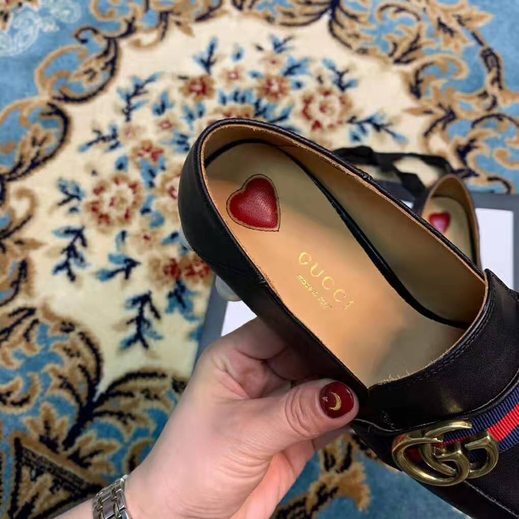 The Double G antique gold-toned hardware is set on a blue and red Web of these leather mid-heel loafers.
