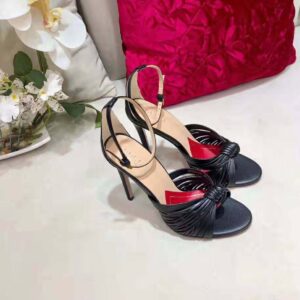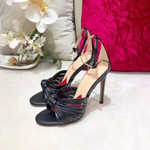 Numerous thin straps come together to form a front knot detail that balances the thin heel of this sandal.