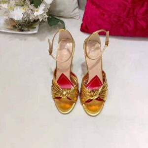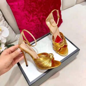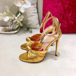 Numerous thin straps come together to form a front knot detail that balances the thin heel of this sandal.