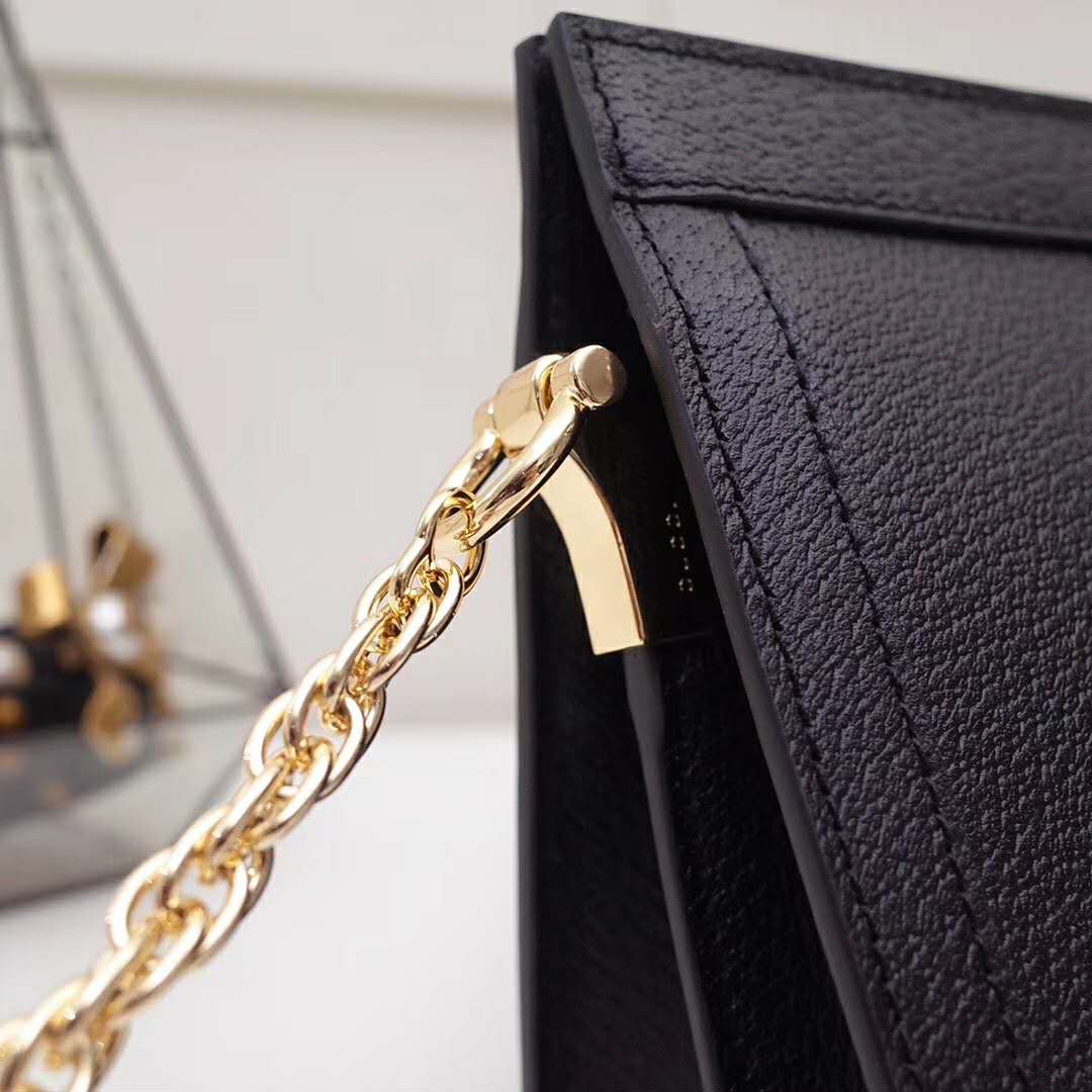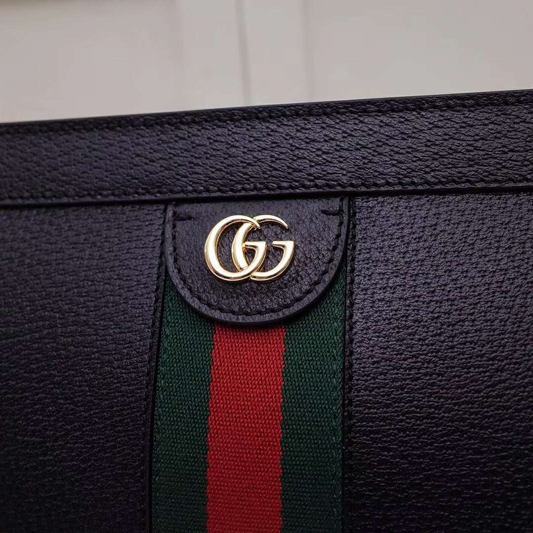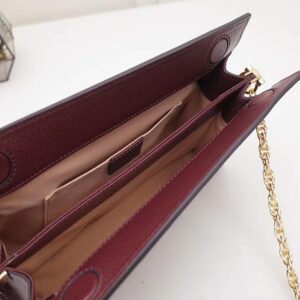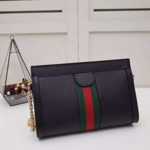 The small chain Ophidia shoulder bag is introduced in a new iteration for Pre-Fall 2019, crafted from black leather with inlaid green and red Web stripe.