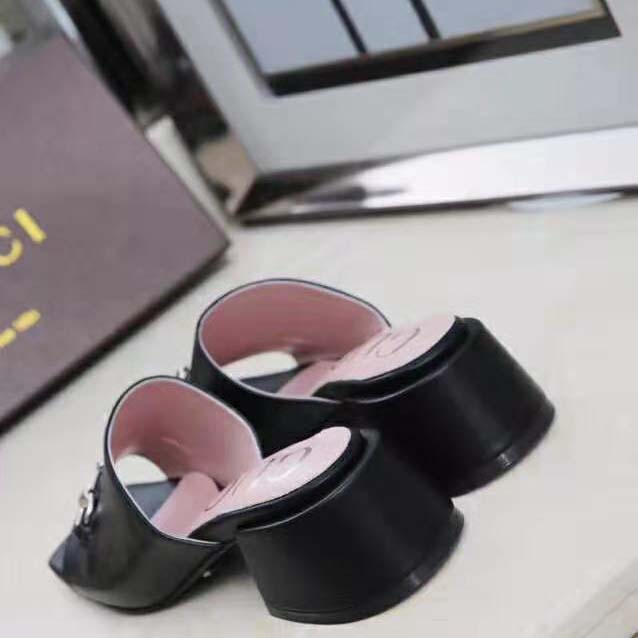 A homage to the equestrian world, the classic Horsebit comes to define a new line of glossy sandals, crafted in patent leather and designed with a chunky heel.