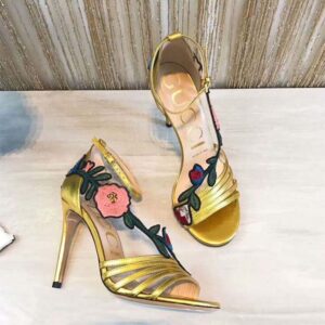 Gucci Women Shoes Embroidered Leather Mid-Heel Sandal 100mm Heel-Yellow