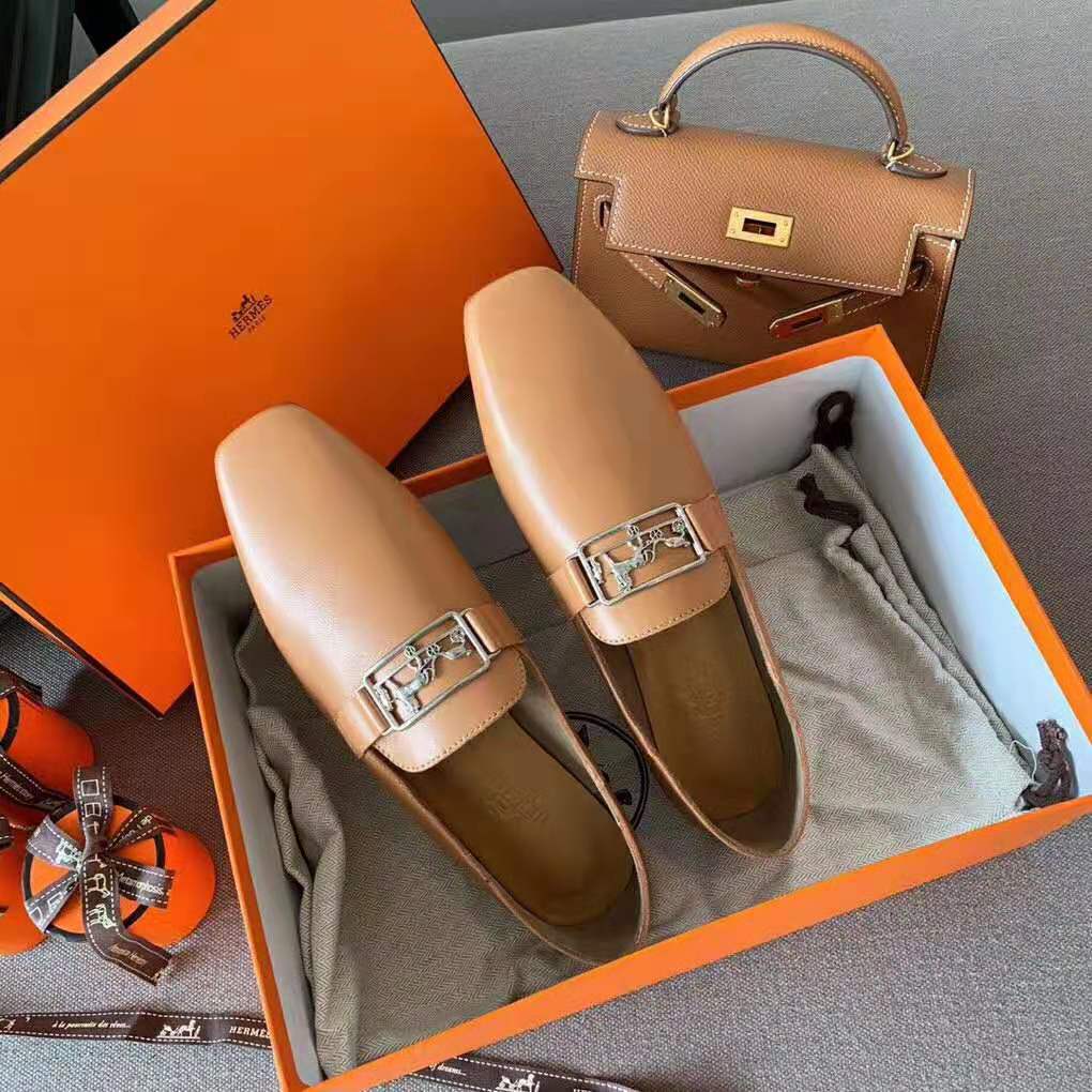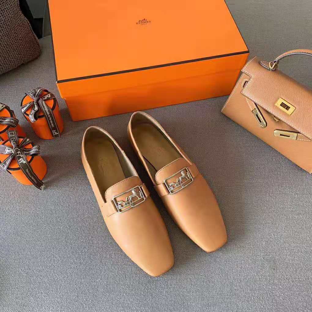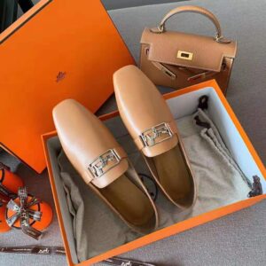 Hermes Women Time Loafer Goatskin with Detailed Openwork Hardware-Brown