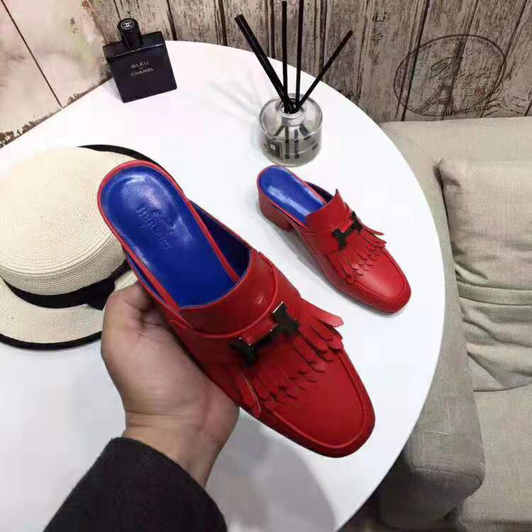 Hermes Women Tuileries Mule Goatskin Tone-On-Tone Fringe Detail-Red