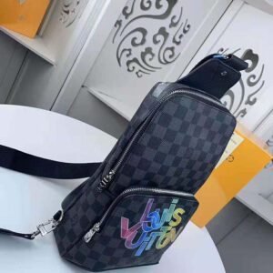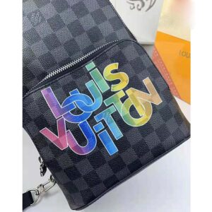 A sporty alternative to the conventional backpack, the Avenue Sling Bag is made from Damier Graphite canvas, signed on the front pocket with the interconnected letters of Virgil Abloh’s new Louis Vuitton logo in a rainbow of colors.