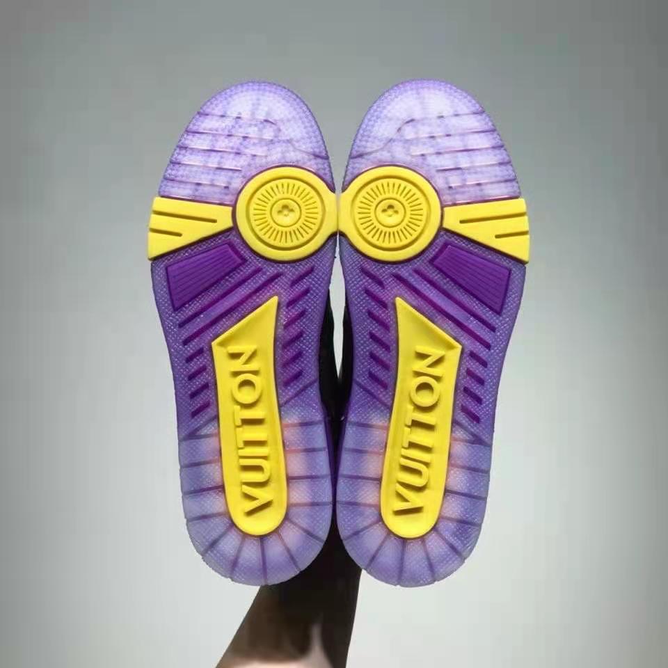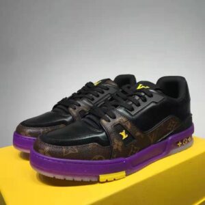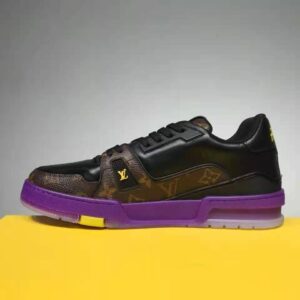 This version of the iconic LV Trainer sneaker combines Monogram canvas with black calf leather. It features distinctive detailing in yellow rubber, including a #54 signature at the back, which refers to 1854, the year Louis Vuitton was founded.