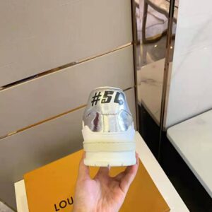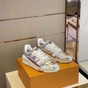 The LV Trainer sneaker comes in metallic silver leather with the Louis Vuitton signature hand-written by Artistic Director Virgil Abloh on the side.
