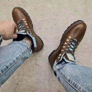 It is distinguished by its hiking-style laces, padded collar and lining, and treaded rubber outsole.