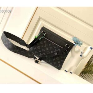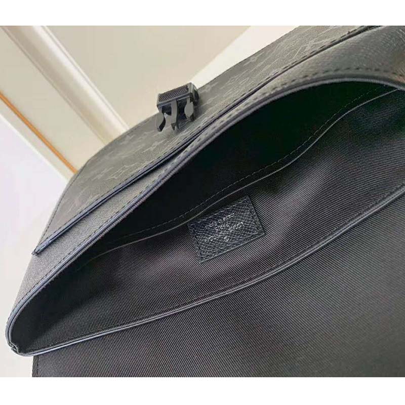 Combining Taiga leather with Monogram Eclipse canvas, this bag has an envelope-style flap which conceals a front pocket and spacious main compartment.