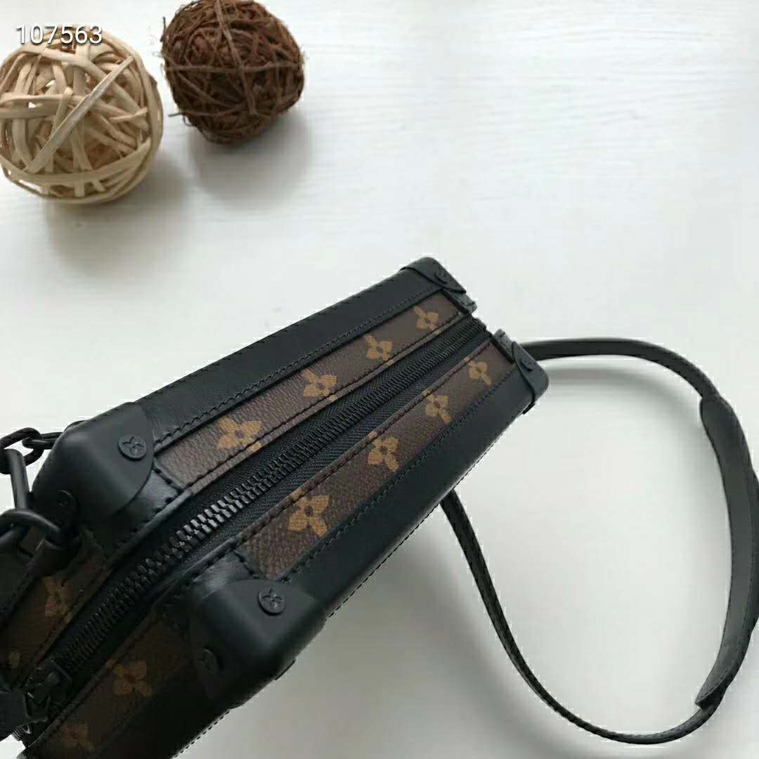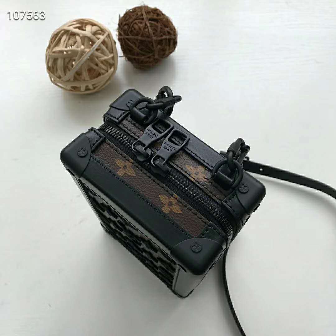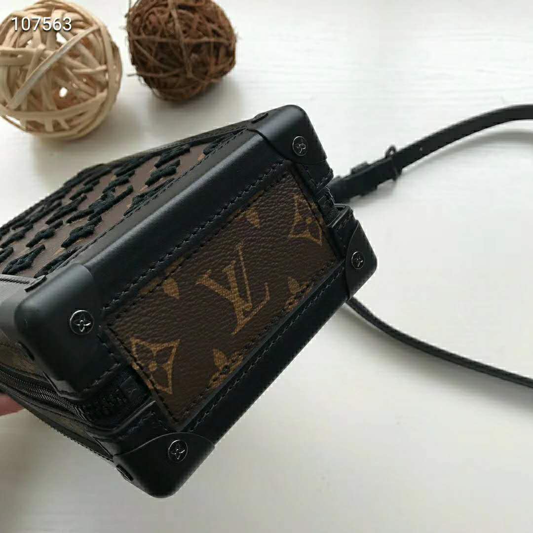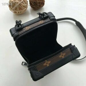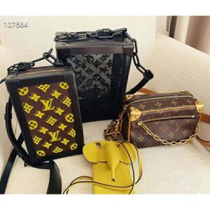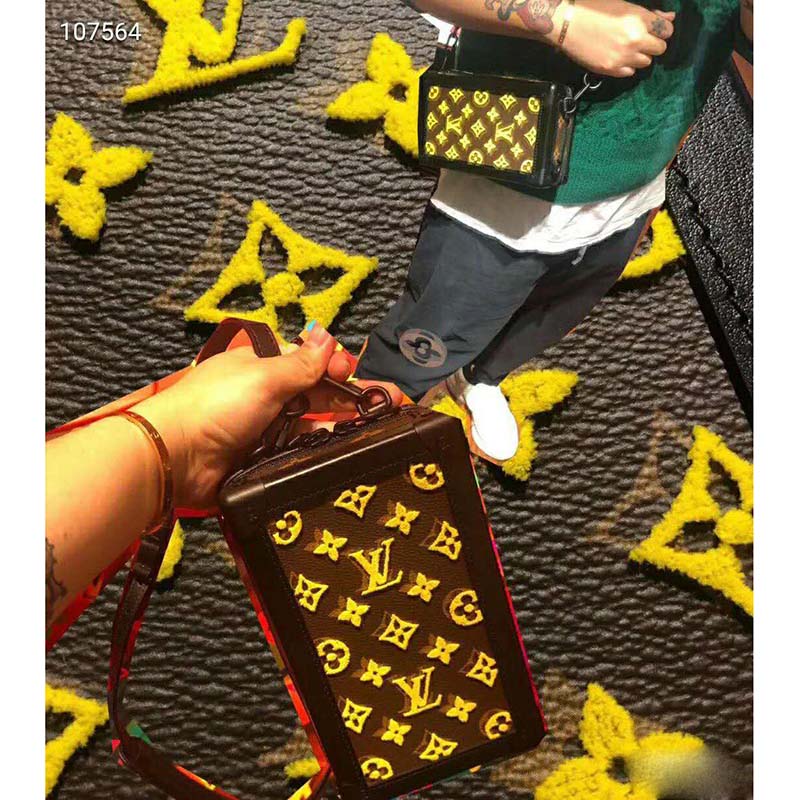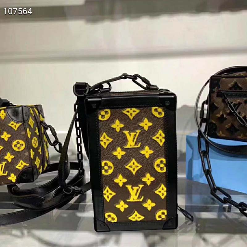 Designed to be worn vertically, the Vertical Soft Trunk bag is a compact version of the Soft Trunk made from coated canvas with an embroidered bright yellow Monogram pattern.