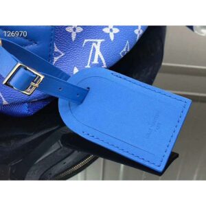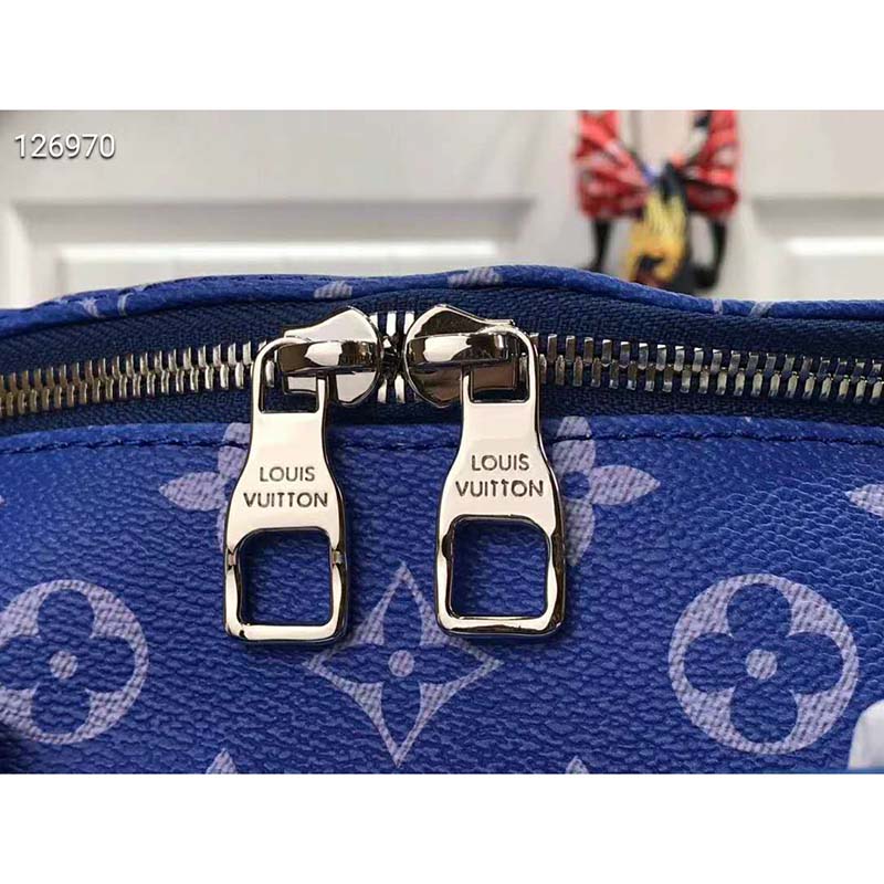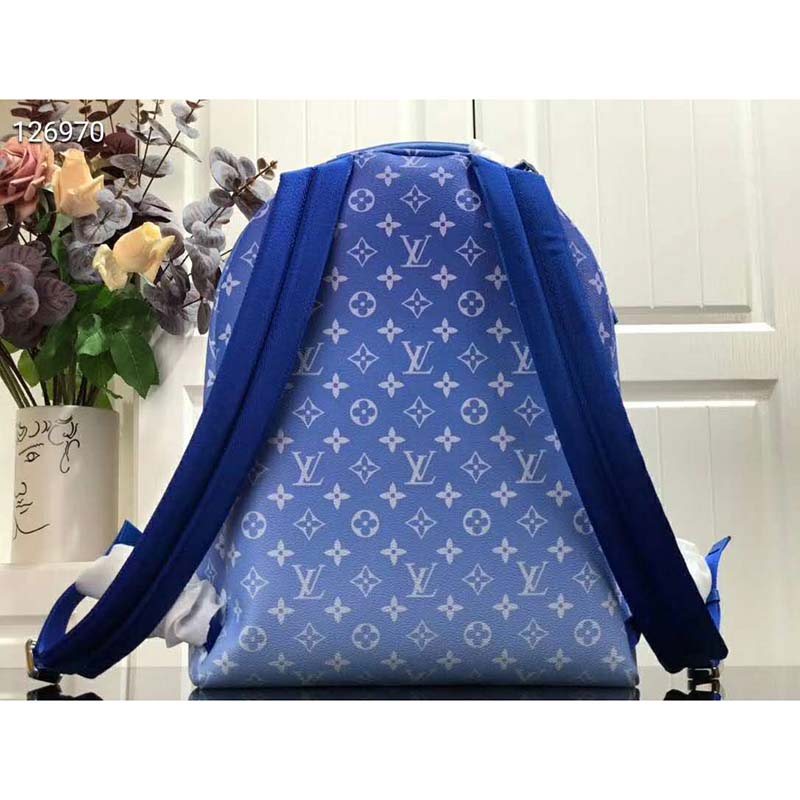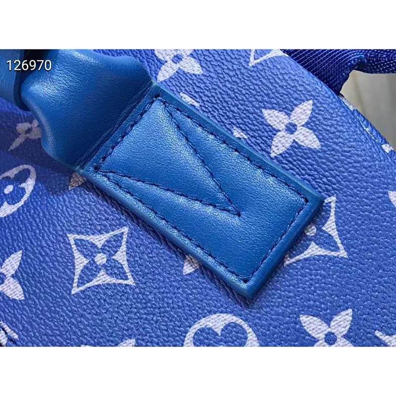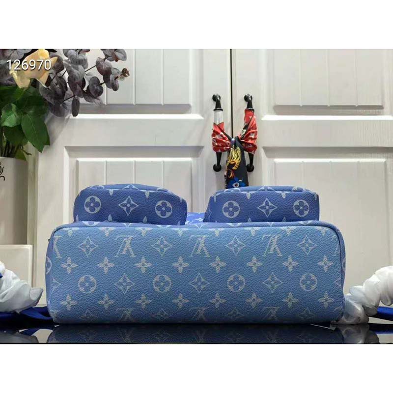The House’s iconic Monogram canvas in enchanting shades of blue is accented by the LV initials spelled out in ethereal clouds.