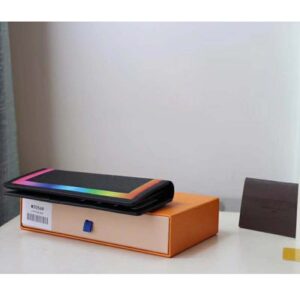 Made from mat-black Taiga leather, it has a bold multi-colored outline.