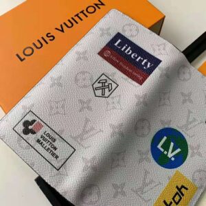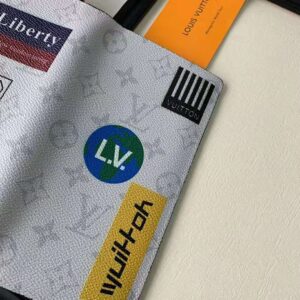 Louis Vuitton’s iconic Monogram canvas provides the background for colorful printed stickers, which lend this practical piece a standout look.