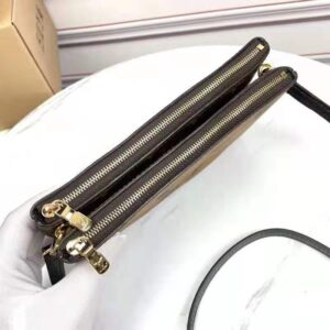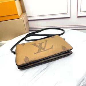 Timeless Monogram and on-trend Monogram Giant Reverse canvas combine on the Double Zip Pochette, which comes with a removable, adjustable leather strap for multiple carry options.