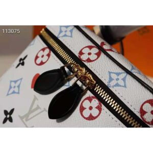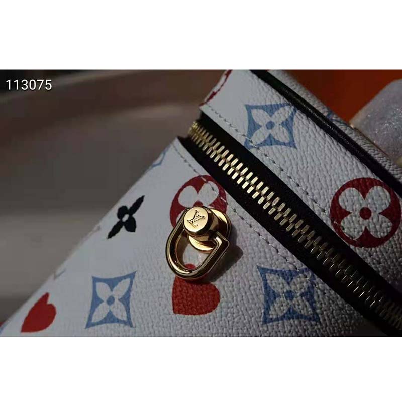 The bag takes on a striking aspect in a Game On pattern transformed by Nicolas Ghesquière, rendered with colored Monogram Flowers in bright blue and red.