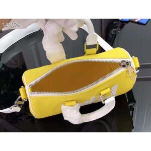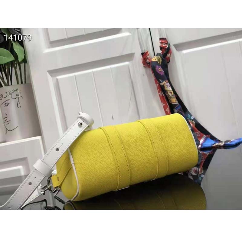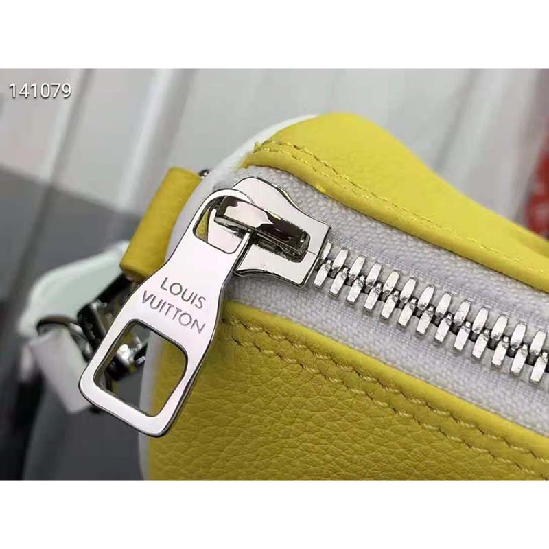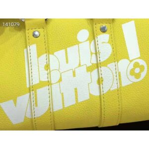 Here Virgil Abloh crafts it from bright yellow leather and signs it with his new “louis vuitton!” graphic.