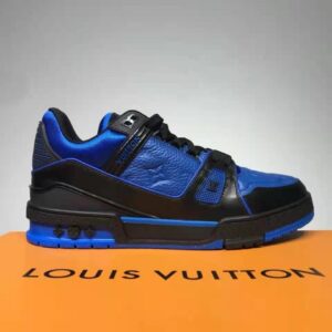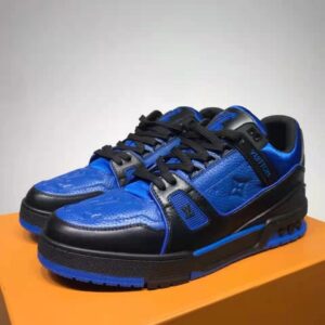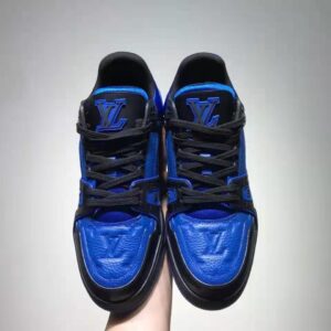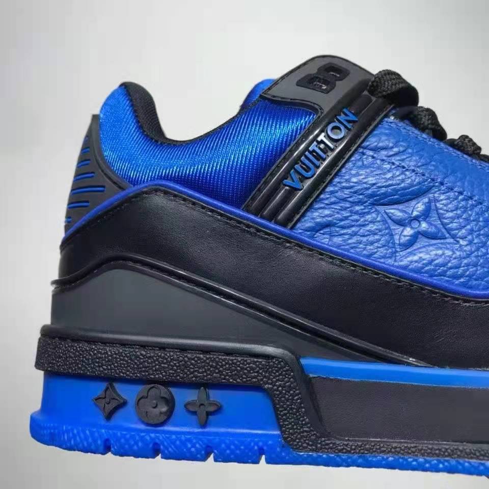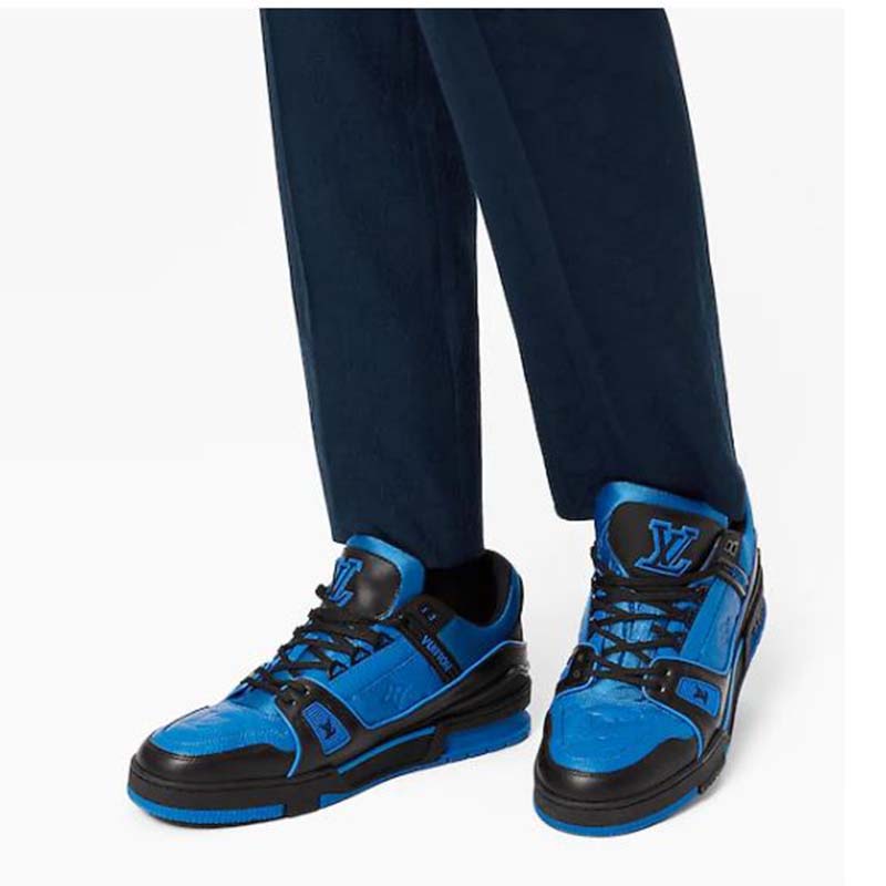 This bicolor version of the LV Trainer sneaker comes in Monogram-embossed grained calf leather with smooth calf-leather trim.