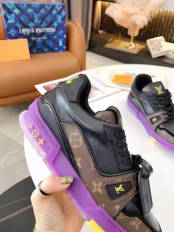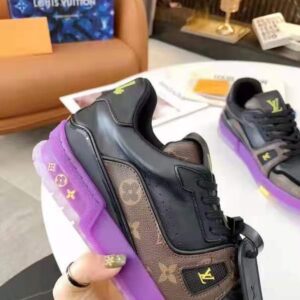 This version of the iconic LV Trainer sneaker combines Monogram canvas with black calf leather. It features distinctive detailing in yellow rubber, including a #54 signature at the back, which refers to 1854, the year Louis Vuitton was founded.