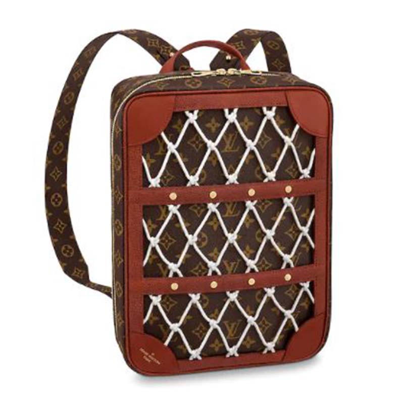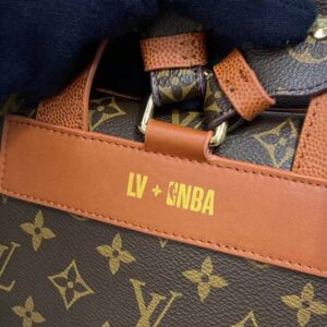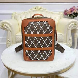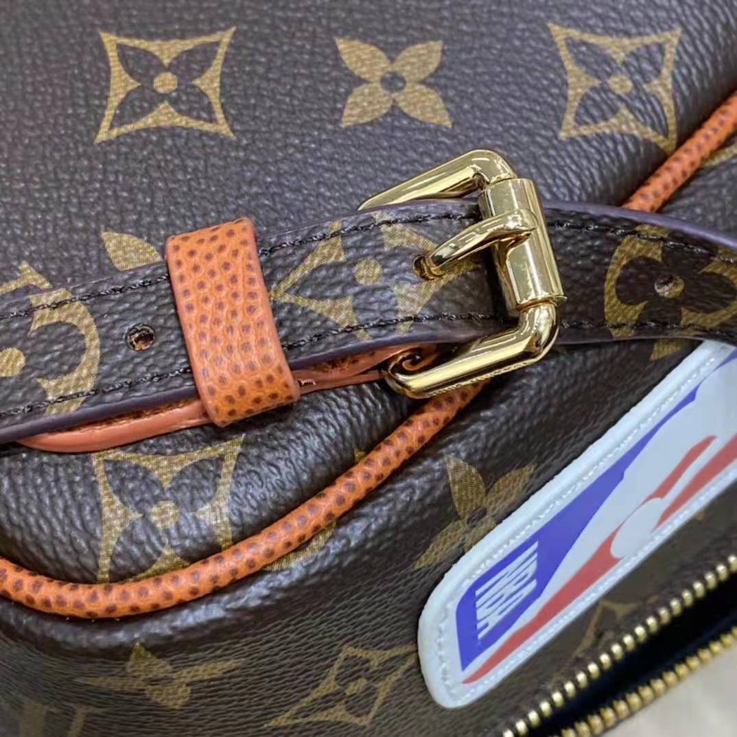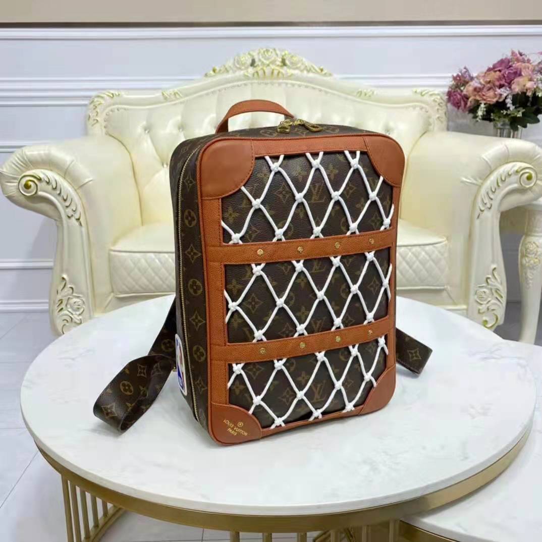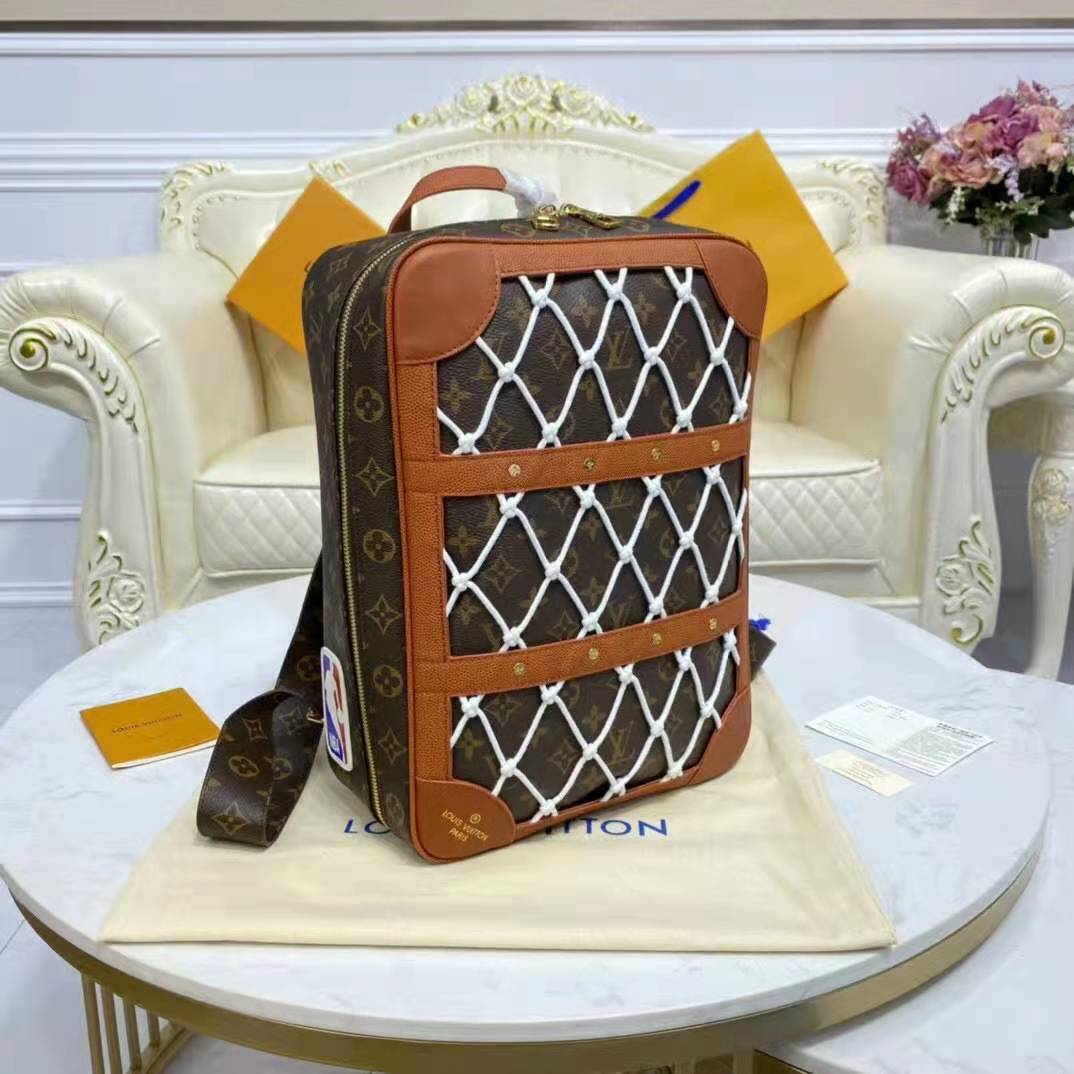 Mixing the design codes of basketball with those of Louis Vuitton, the front of the backpack features basketball netting over Monogram canvas, framed in Ball Grain leather with rivets.
