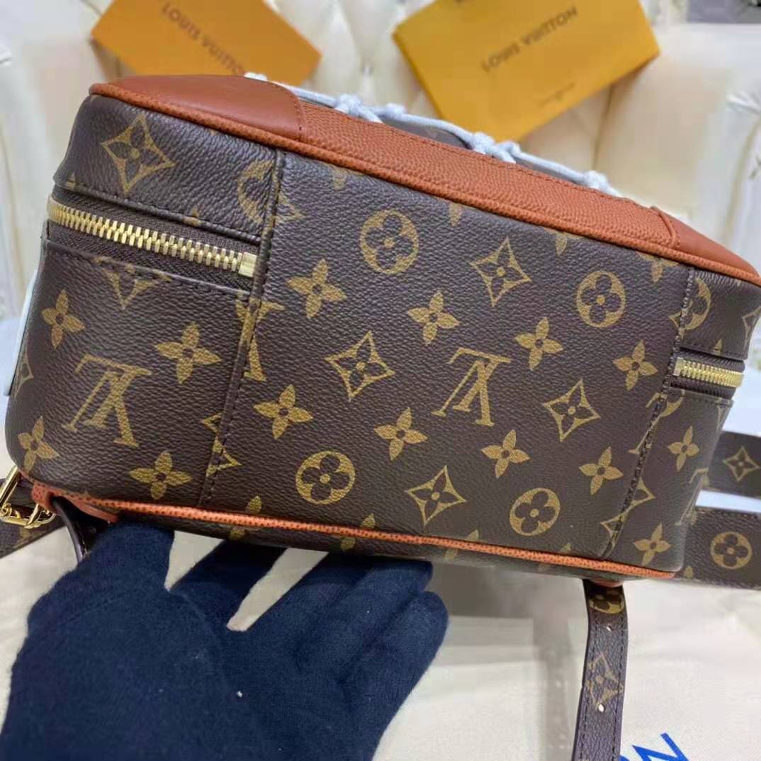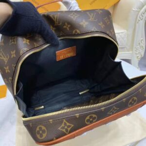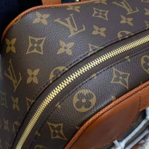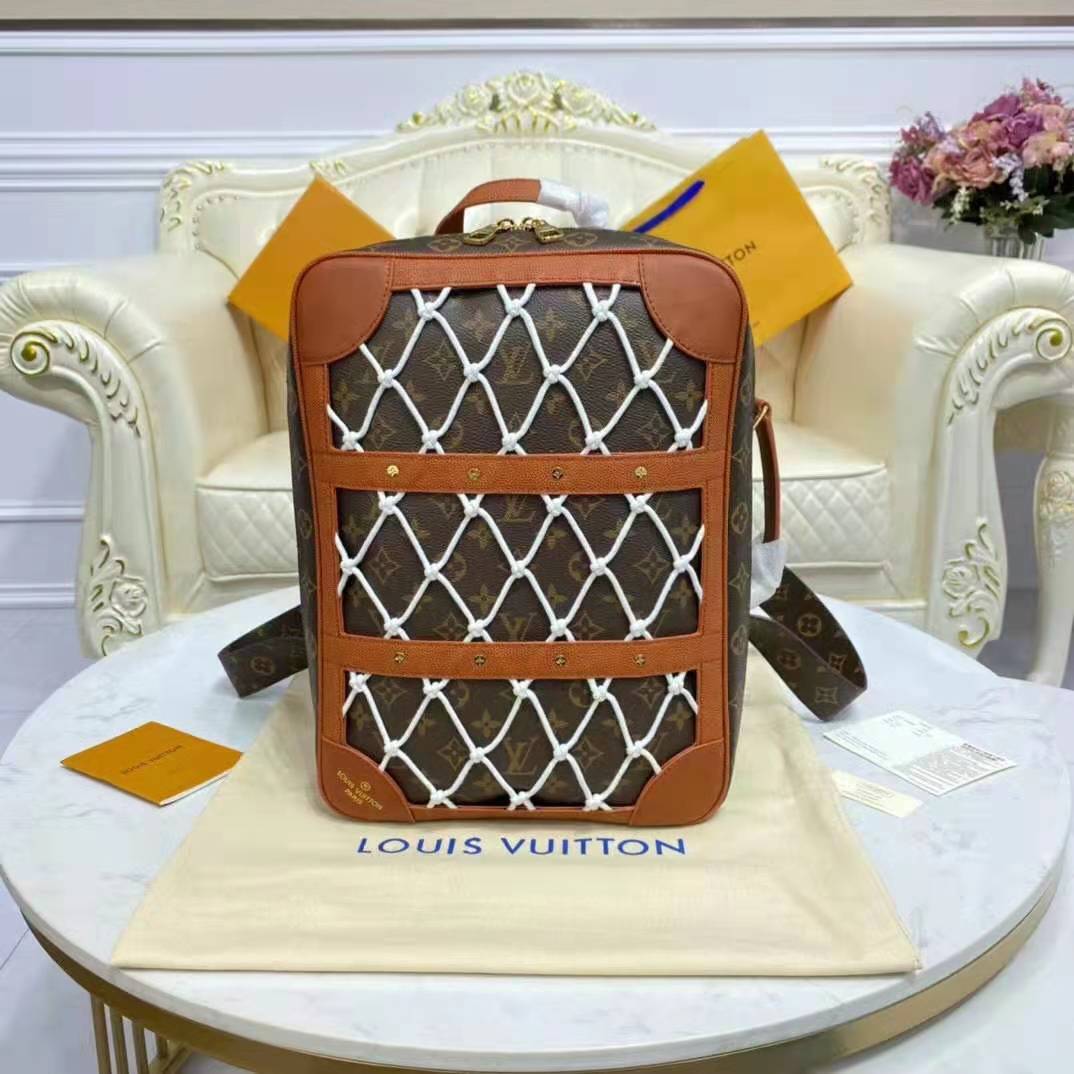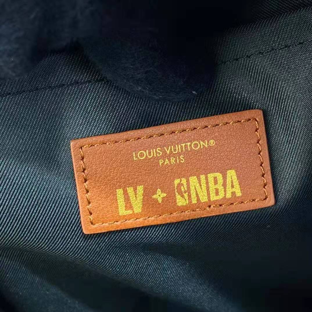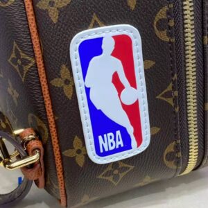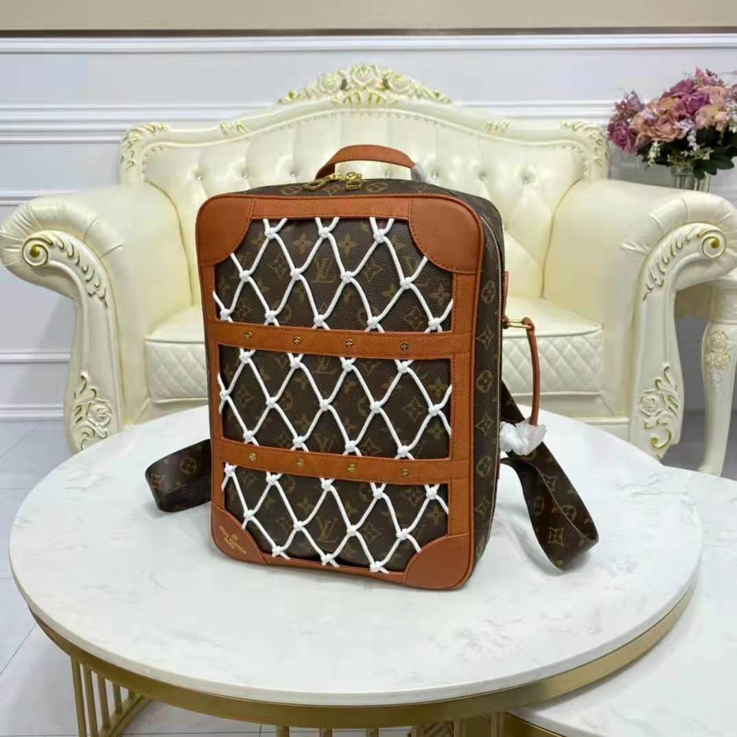Mixing the design codes of basketball with those of Louis Vuitton, the front of the backpack features basketball netting over Monogram canvas, framed in Ball Grain leather with rivets.